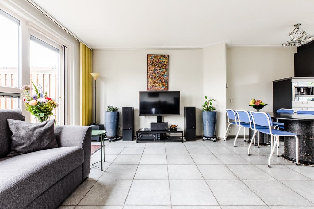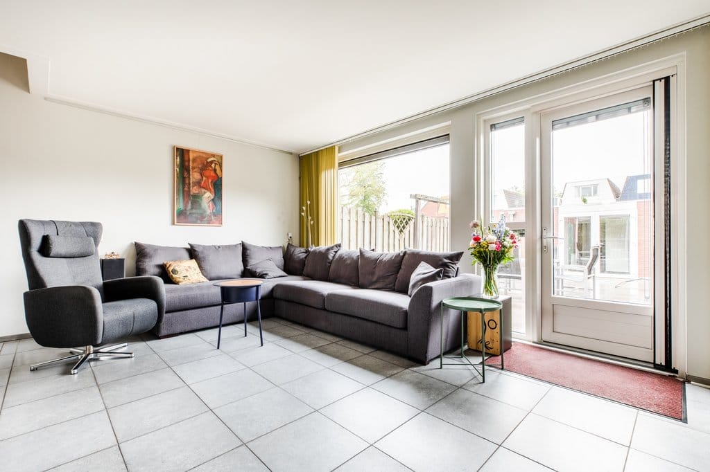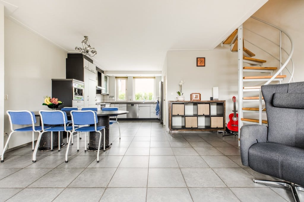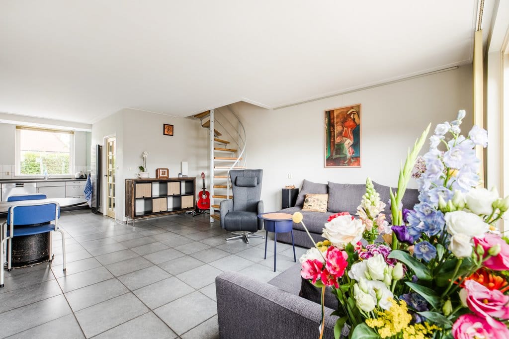 Gezellige sfeervolle living afgewerkt met een tegelvloer voorzien van vloerverwarming, pleisterwerk wanden en een -plafond.