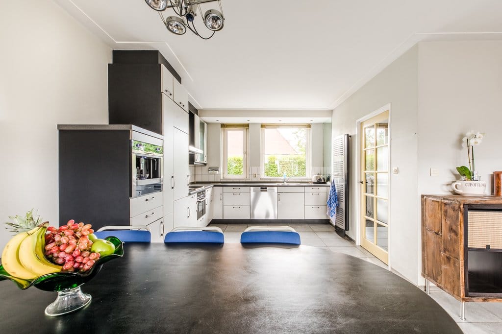 Open keuken afgewerkt met een tegelvloer, deels tegelwerk wanden en een pleisterwerk plafond met inbouwverlichting.