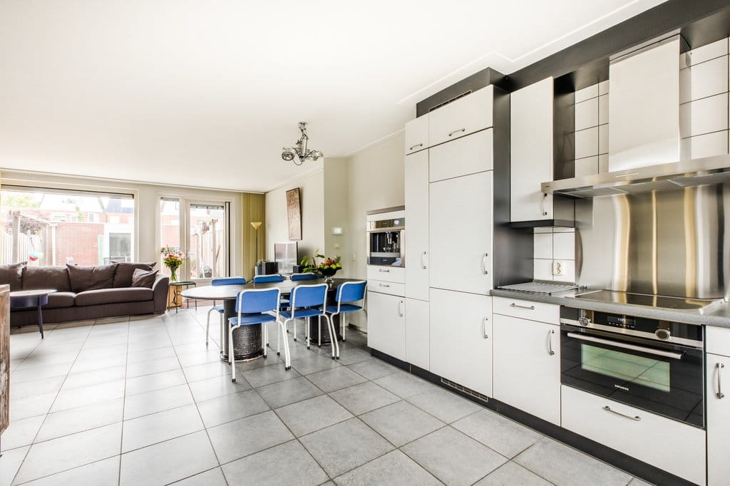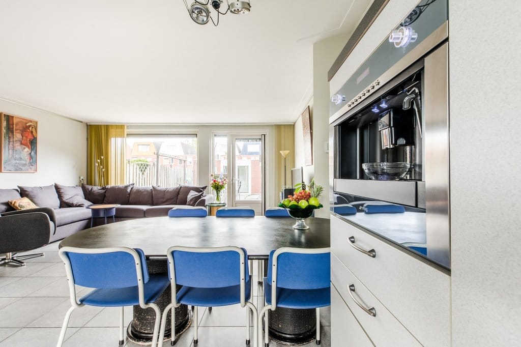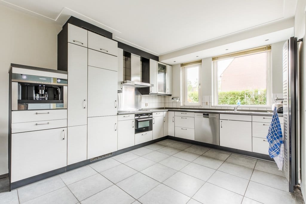 De praktische en complete keukeninrichting in hoekopstelling is voorzien van diverse laden en kasten, apothekerskast, vaatwasmachine, rvs spoelbak, close in boiler, oven/magnetron combinatie, halogeen kookplaat, rvs afzuigkap, koelkast gecombineerd met 3 vriesladen en een ingebouwde koffie machine.