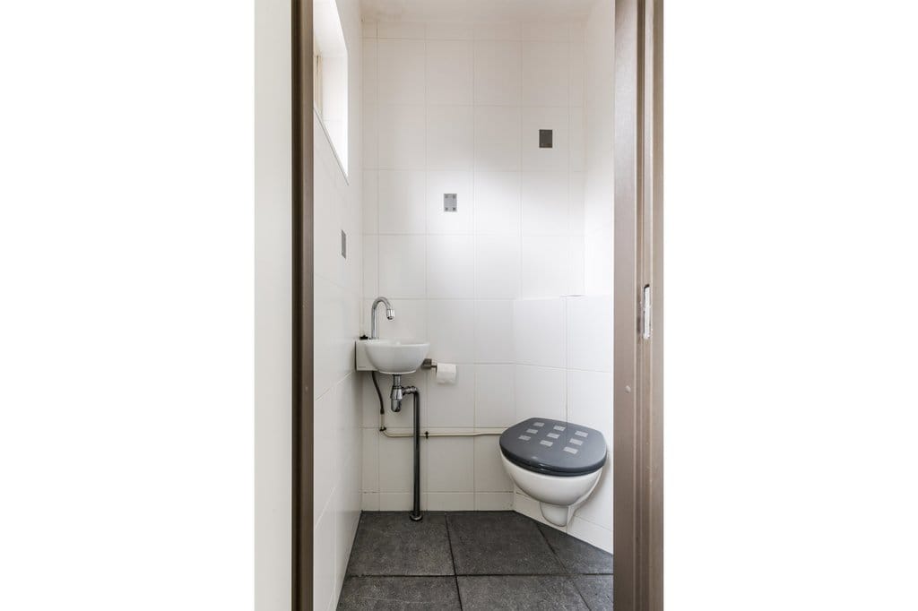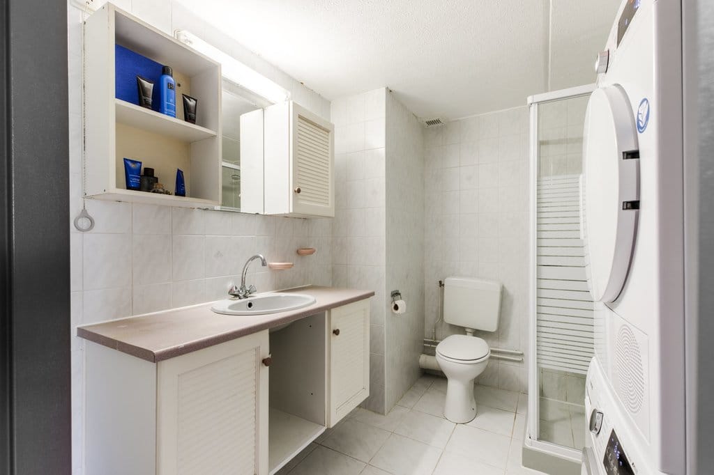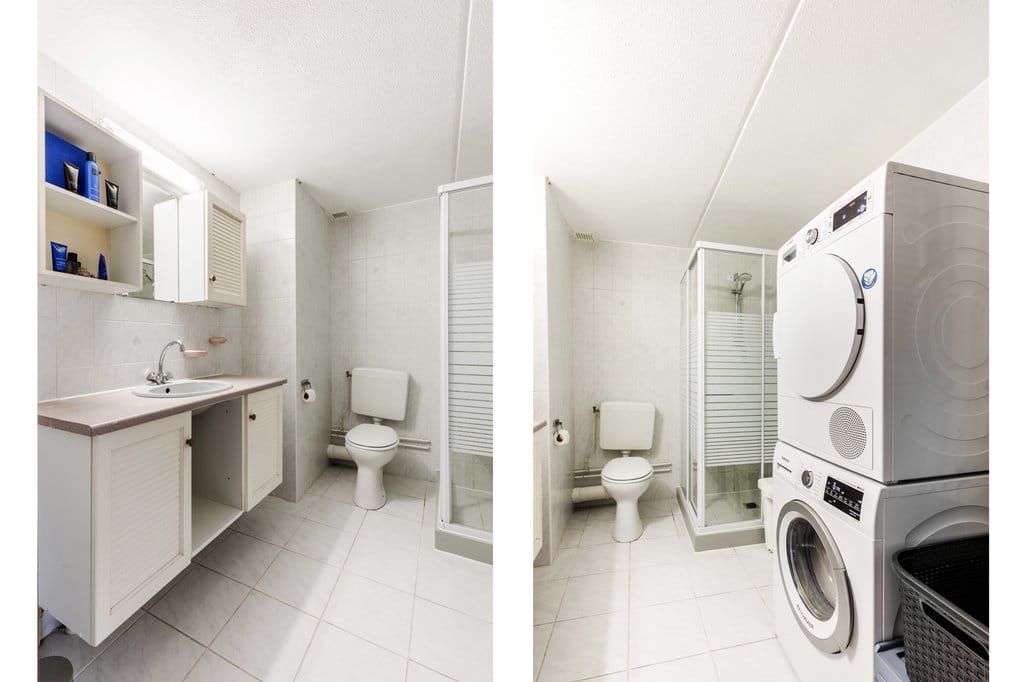 Geheel betegelde badkamer voorzien van een separate douchecabine met thermostaatkraan, toilet, wastafel en aansluiting t.b.v. wasapparatuur.