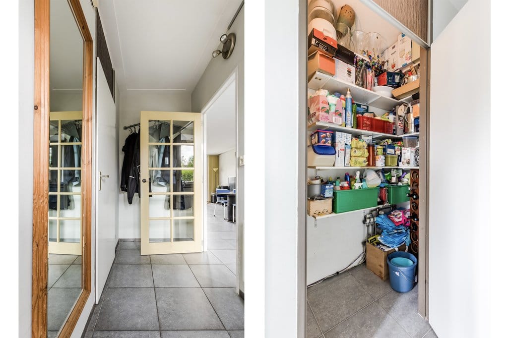 Proviandkast met legplanken en toegang tot de meterkast met de water-, gas- en elektrameter en elektrakast met diverse groepen en aardlekschakelaars.