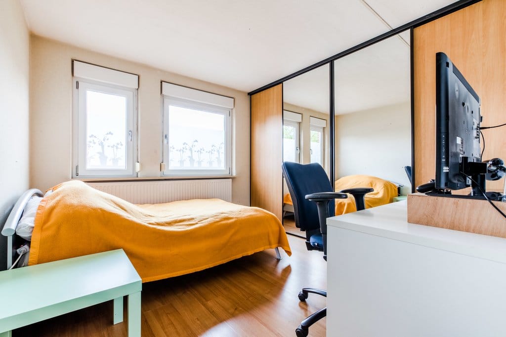 Slaapkamer 2 aan achterzijde afgewerkt met een laminaatvloer, spachtelputz wanden en een spuitwerk plafond.