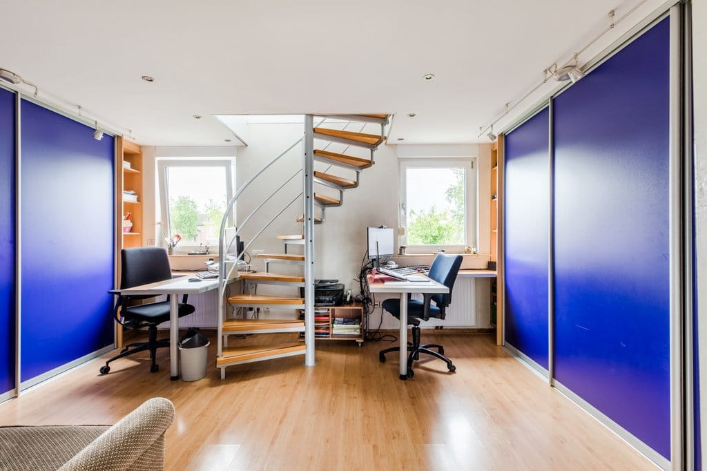 Werkkamer aan voorzijde met 2 ingebouwde kastwanden, 2 vaste bureau's en afgewerkt met een laminaatvloer, pleisterwerk wanden en -plafond met inbouwverlichting.