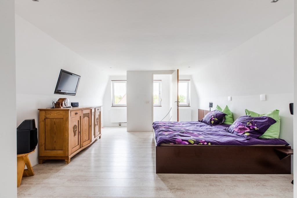 Slaapkamer 1 aan achterzijde afgewerkt met een laminaatvloer, spachtelputz wanden en een spuitwerk plafond.