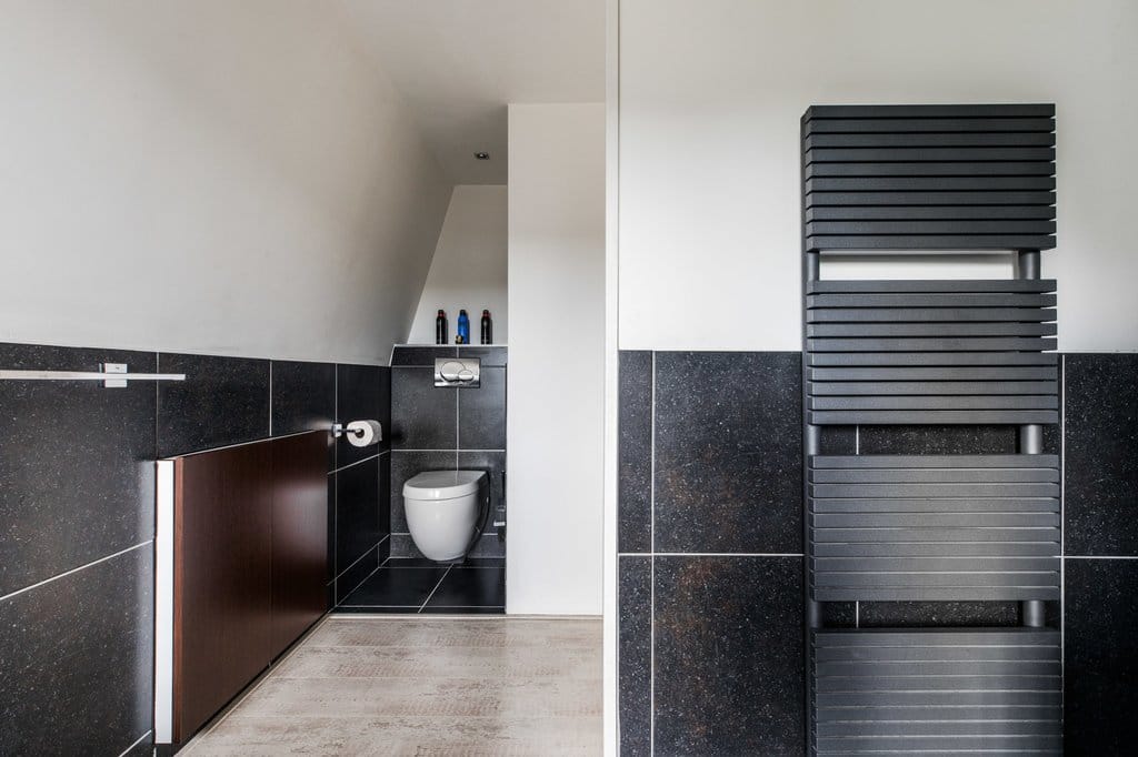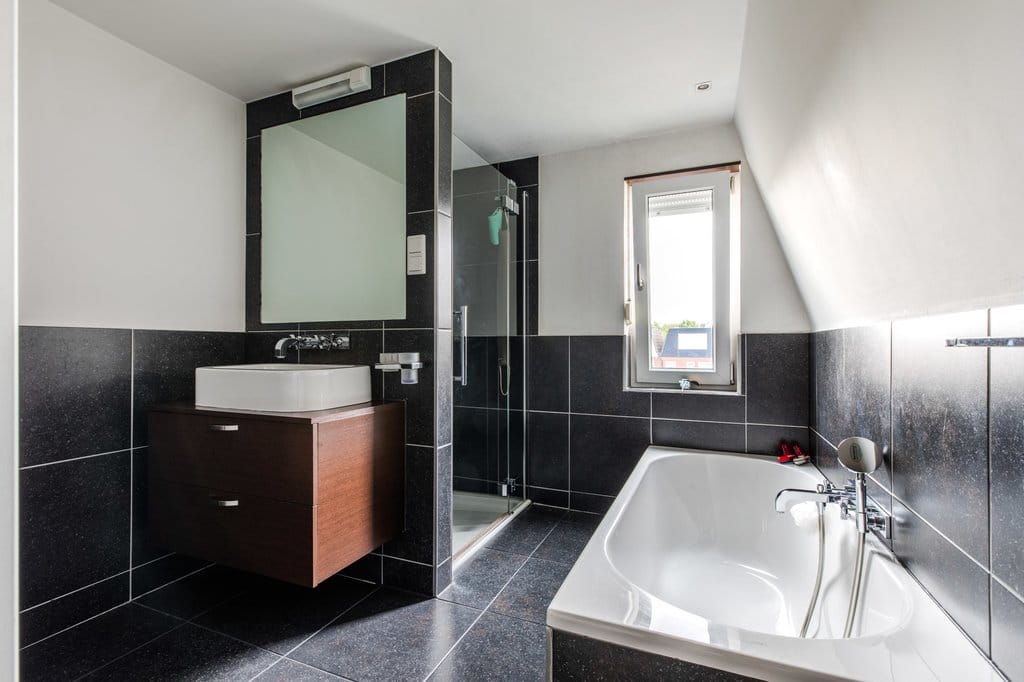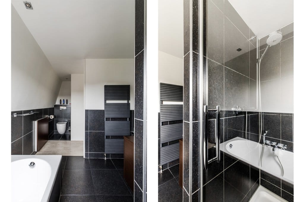 De moderne en luxe afgewerkte badkamer welke is voorzien van een zwevend closet, design radiator, kunststof ligbad, badmeubel met vaste wastafel en de afsluitbare inloopdouche met thermostaatkraan.