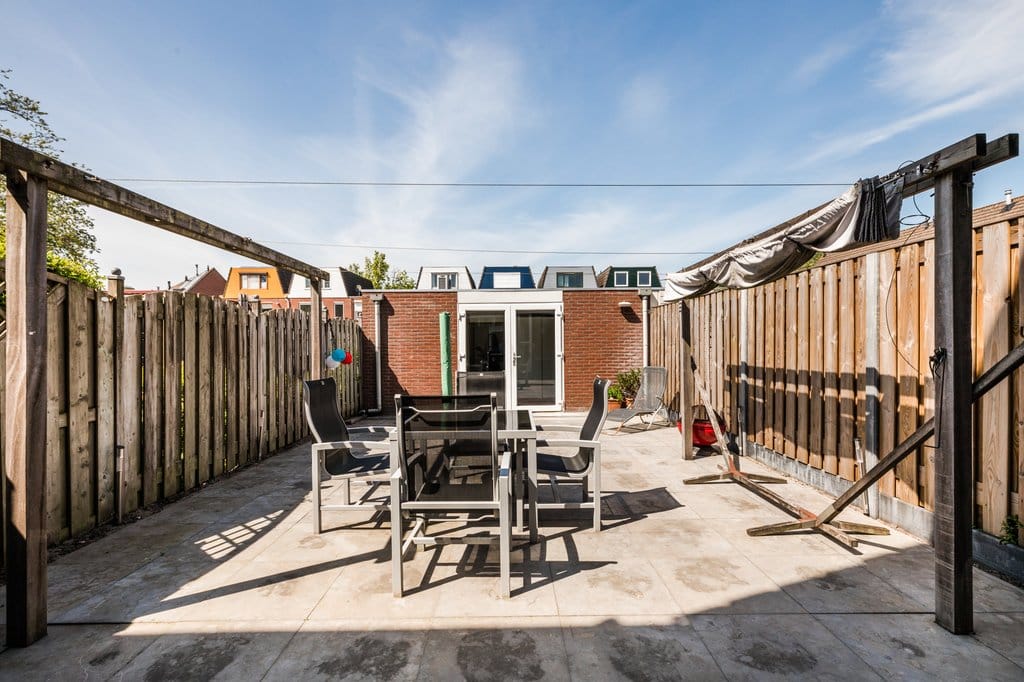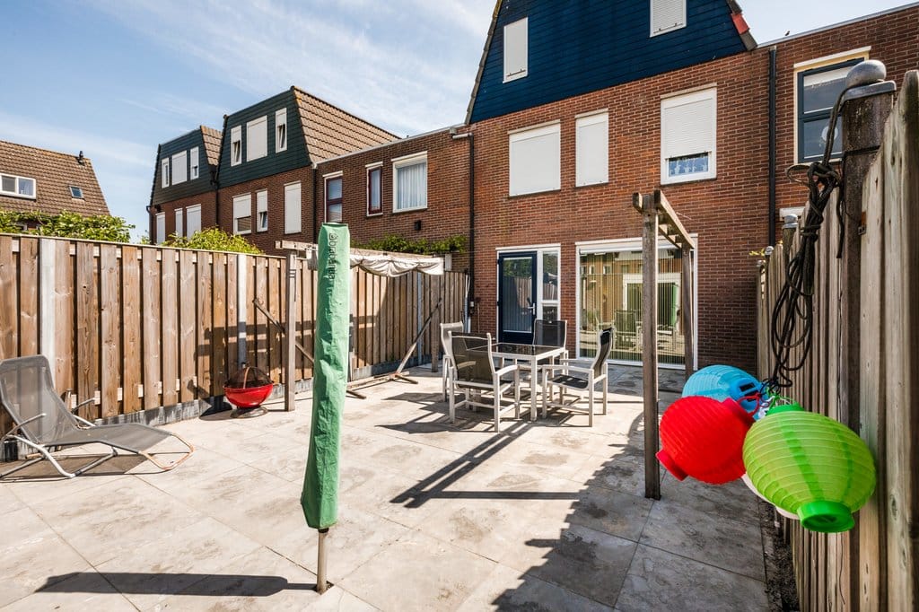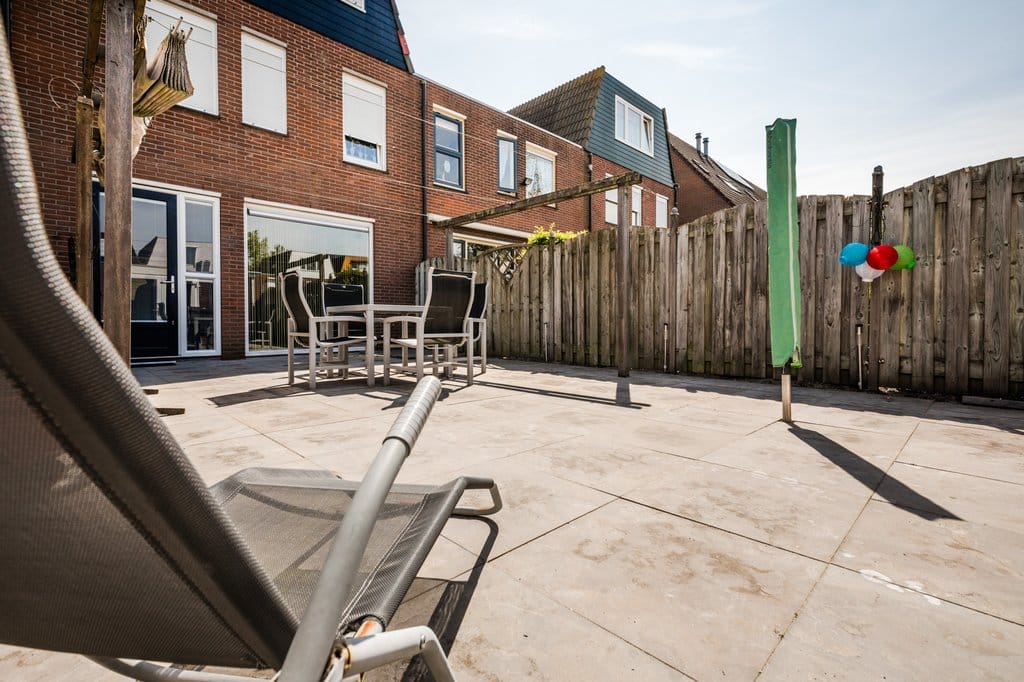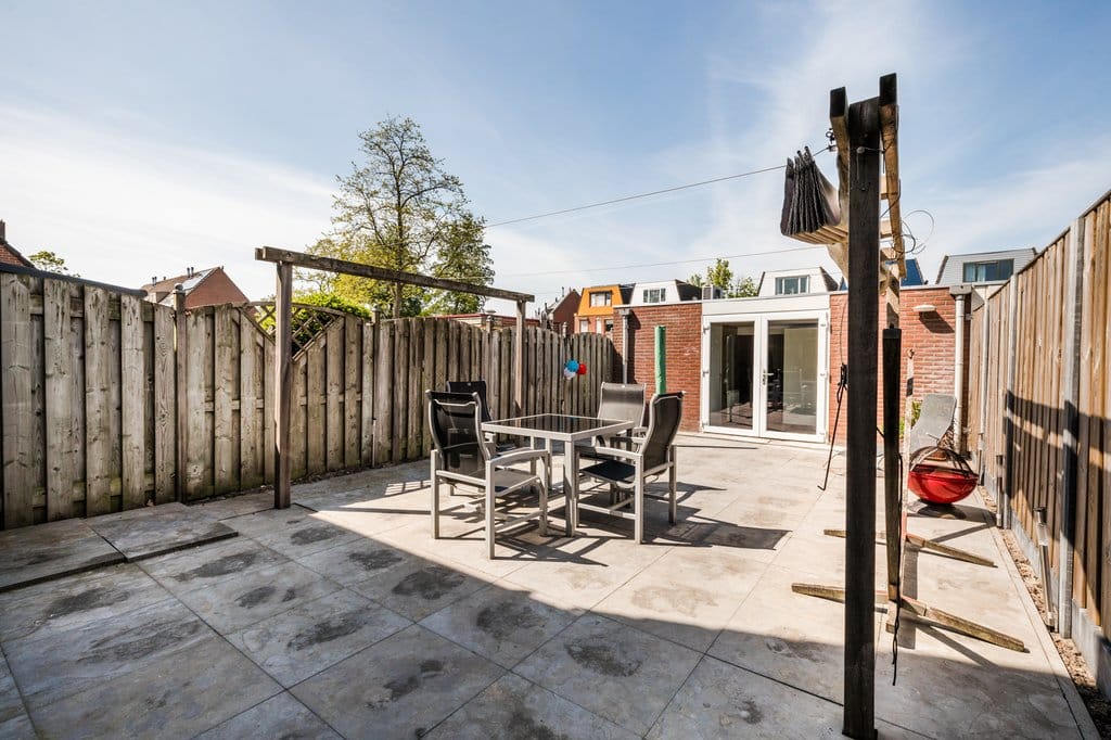 Circa 9 meter diepe achtertuin met een houten delen erfafscheiding en aangelegd met mooie siertegels.