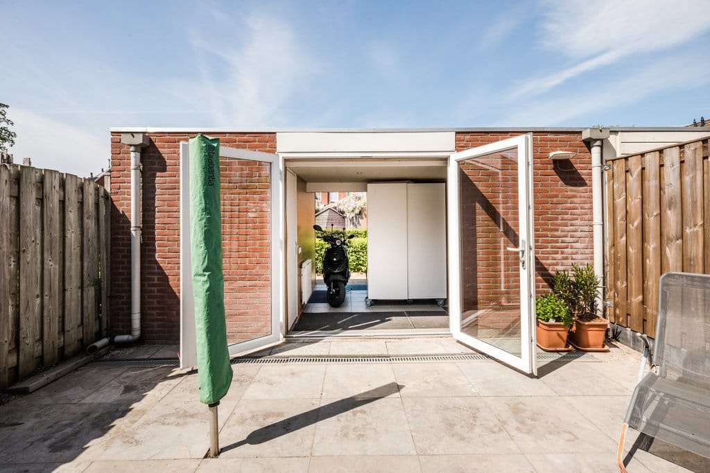Vrijstaande royale deels geïsoleerde berging opgetrokken in metselwerk met openslaande kunststof tuindeuren en brede kunststof loopdeur naar achterom voorzien van 5-punt sluiting.
