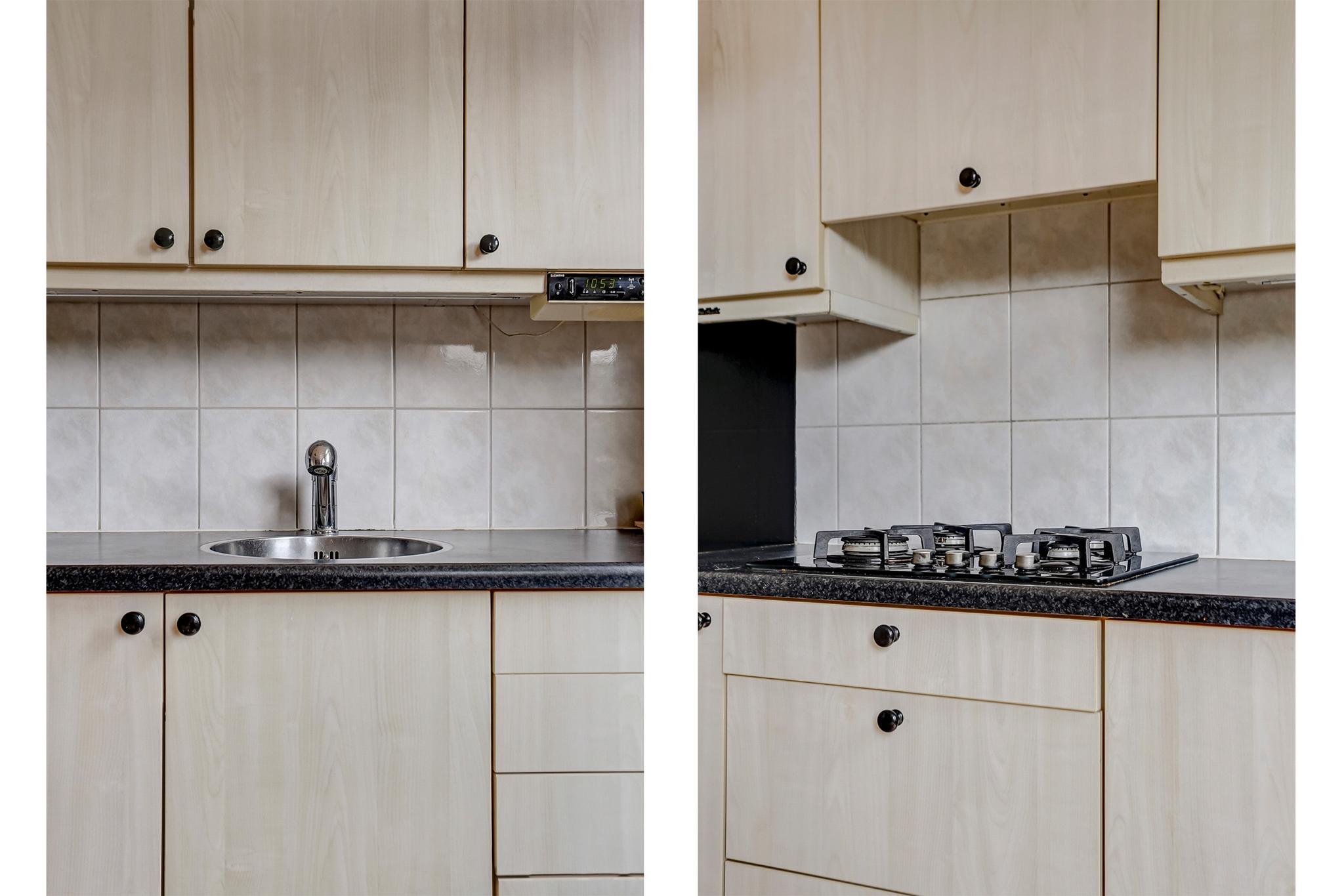 Open keuken met een praktische keukeninrichting voorzien van diverse laden en kasten, kunststof werkblad inclusief rvs spoelbak, koelkast, oven/magnetron combinatie, 4-pits gaskookplaat en een afzuigkap.