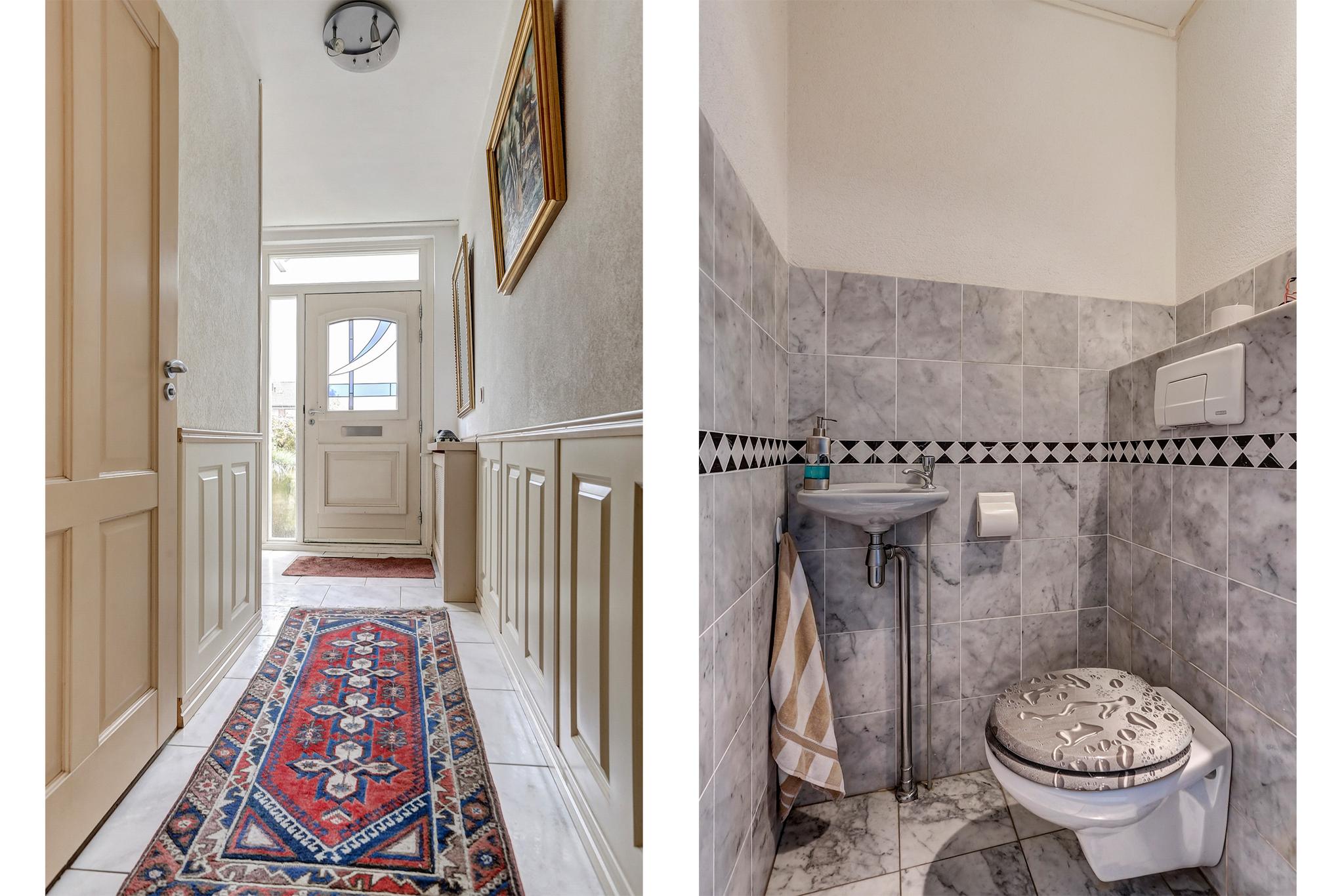 Hal afgewerkt met een tegelvloer, stucwerk wanden (spachtelputz) en een spuitwerk plafond.