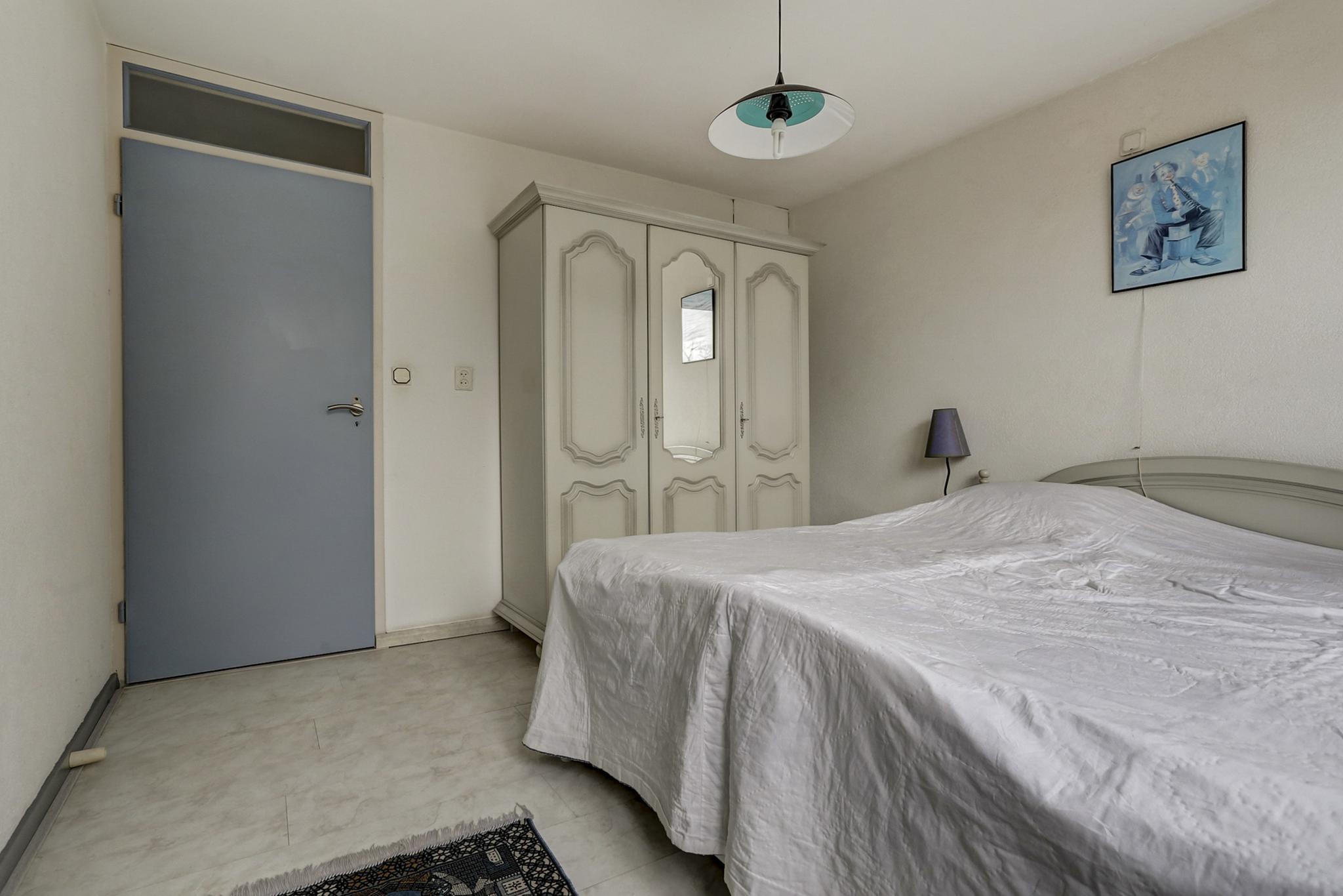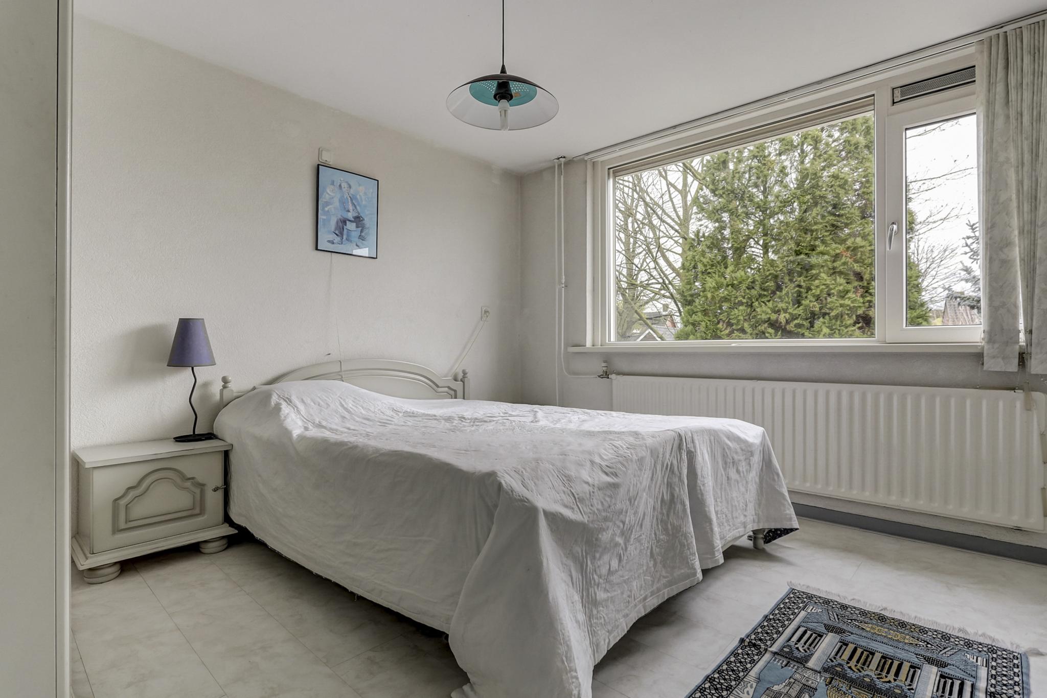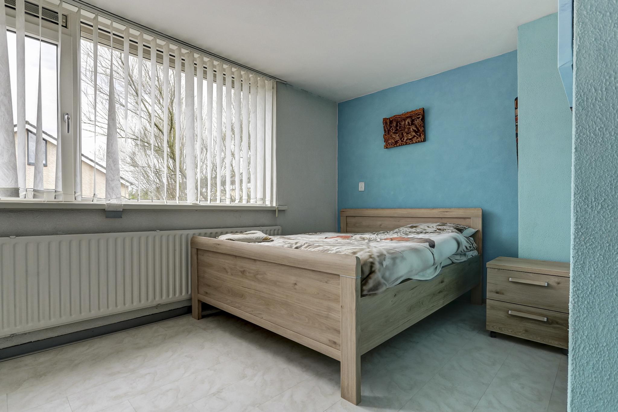 Slaapkamer 1 aan achterzijde is afgewerkt met een laminaatvloer, stucwerk (spachtelputz wanden) en een spuitwerk plafond.