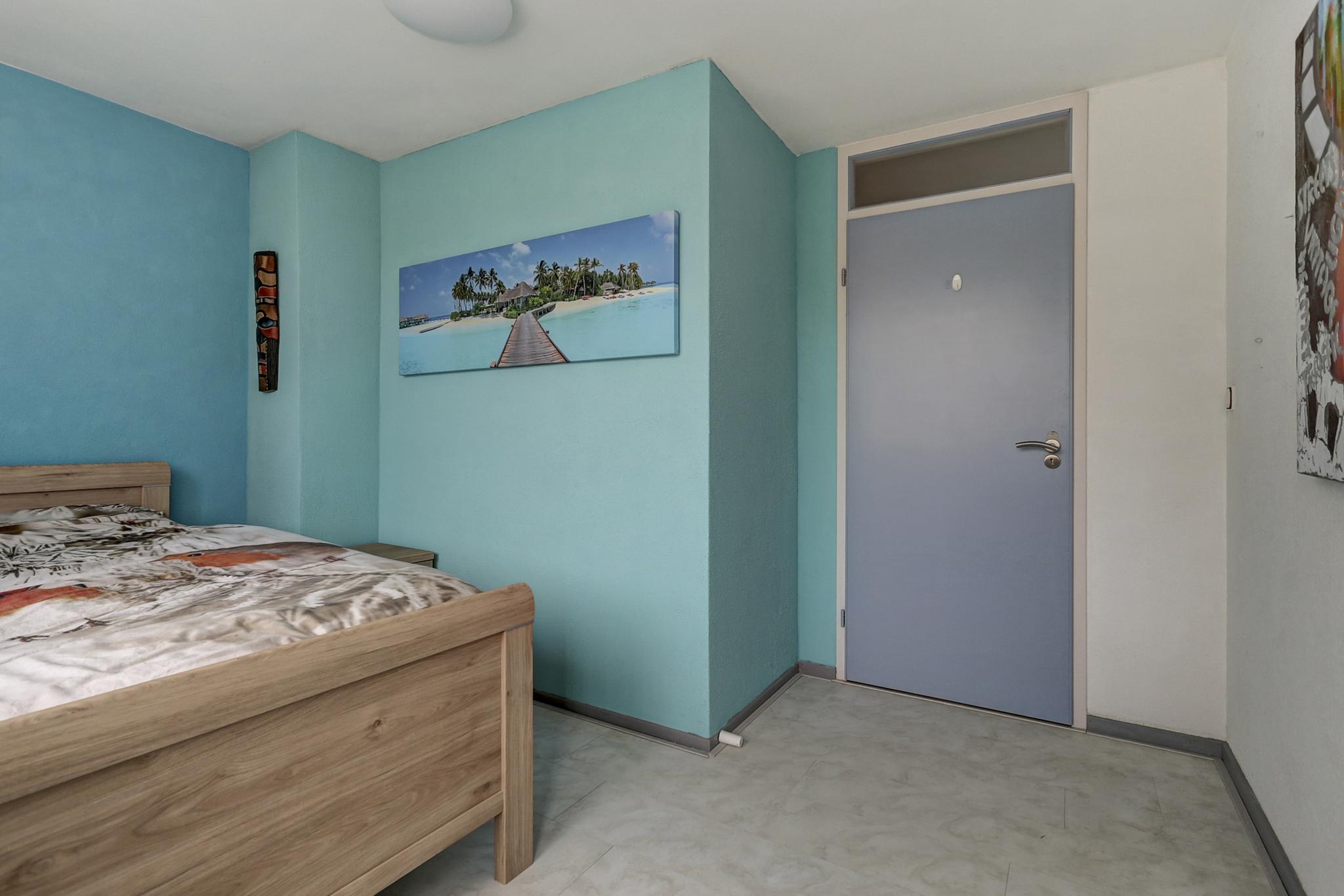 Slaapkamer 3 aan voorzijde is afgewerkt met een laminaatvloer, stucwerk (spachtelputz) wanden en een spuitwerk plafond.