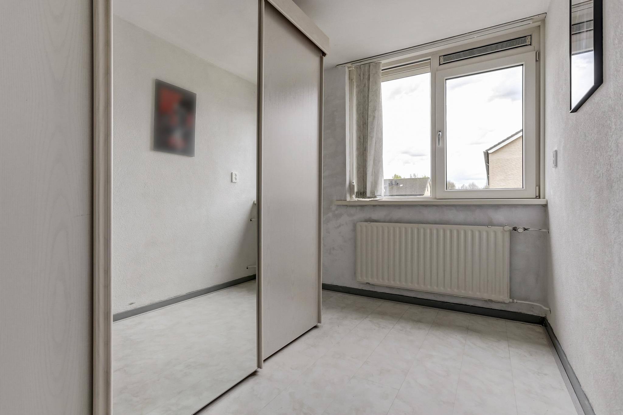 Slaapkamer 4 aan voorzijde is afgewerkt met een laminaatvloer, spachtelputz wanden en een spuitwerk plafond.