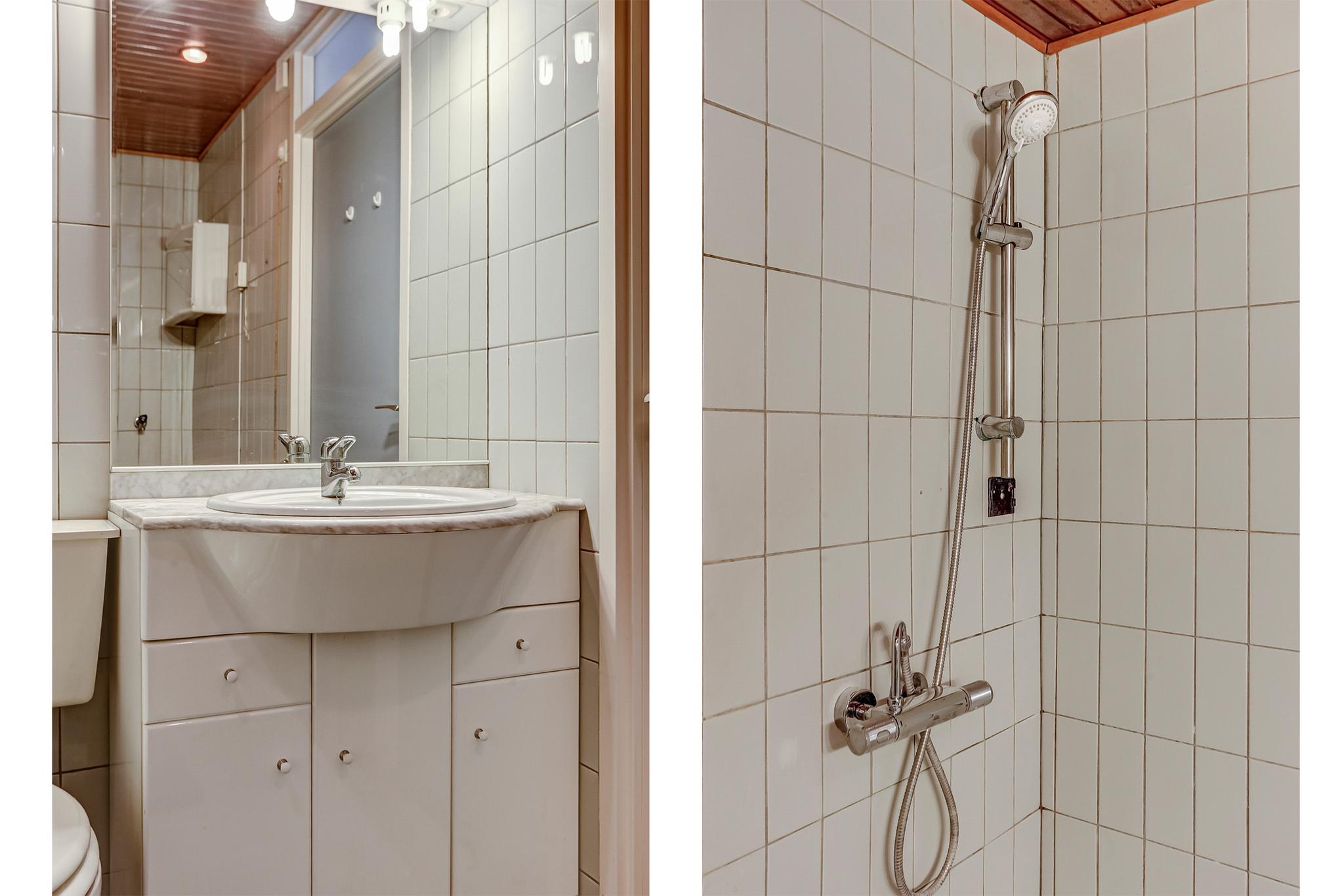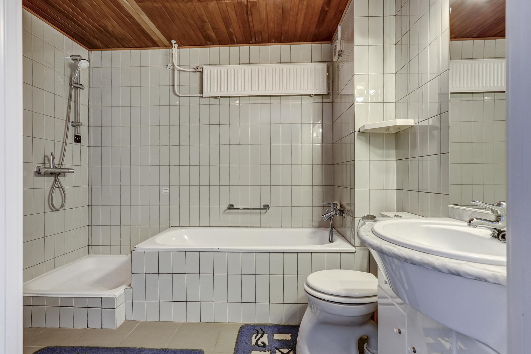 Betegelde badkamer voorzien van een ligbad, douche, badmeubel met wastafel en een closet.