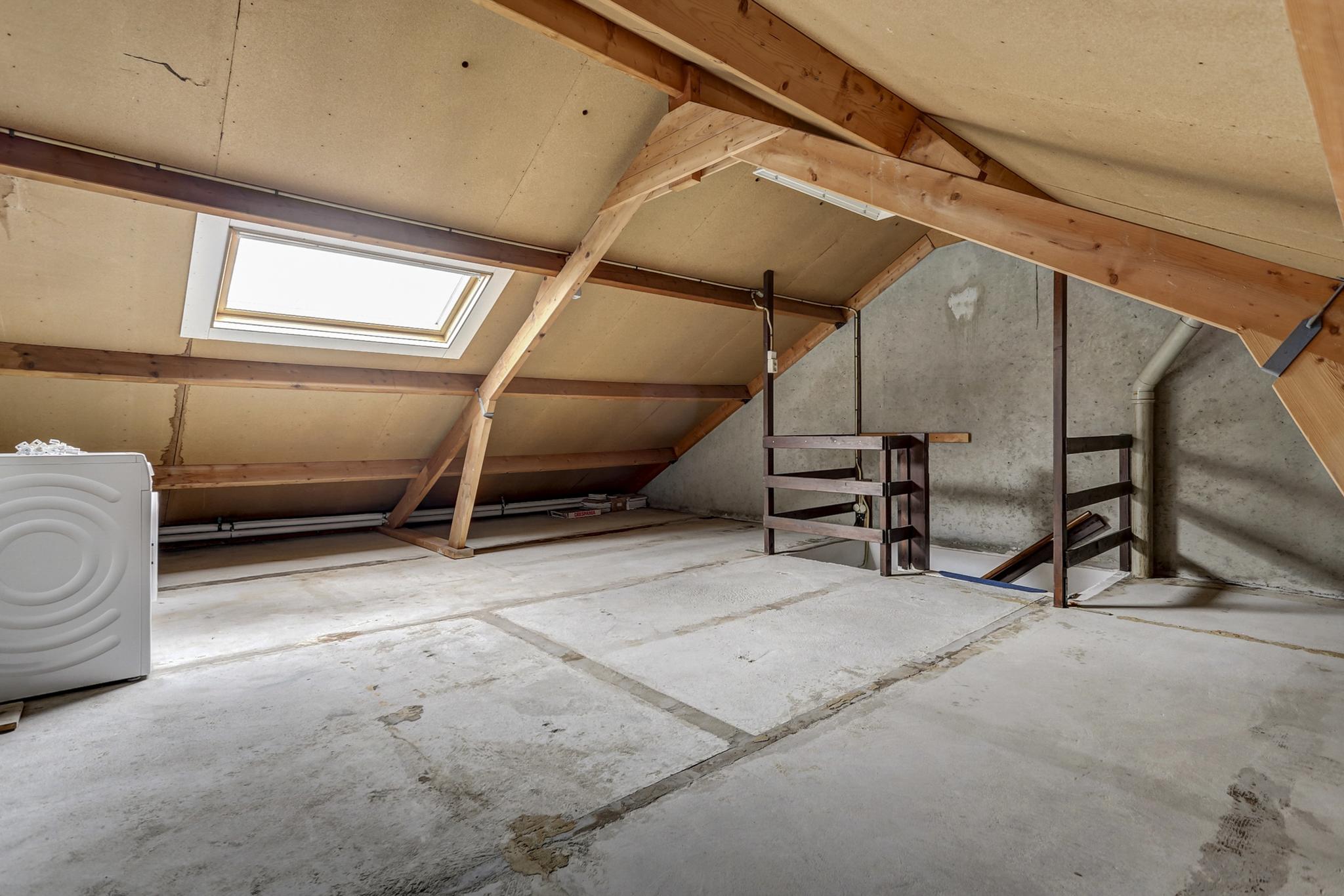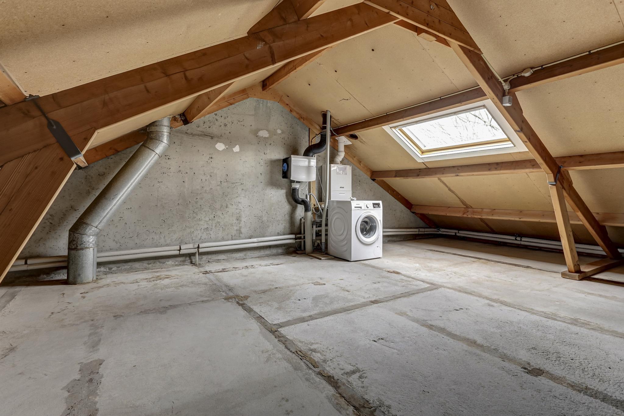 Ruime zolderkamer met een Velux dakvenster, aansluiting t.b.v. wasapparatuur, unit t.b.v. de mechanische ventilatie en de opstelling van de HR c.v. combiketel van het merk Atag uit 2021.