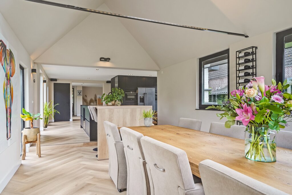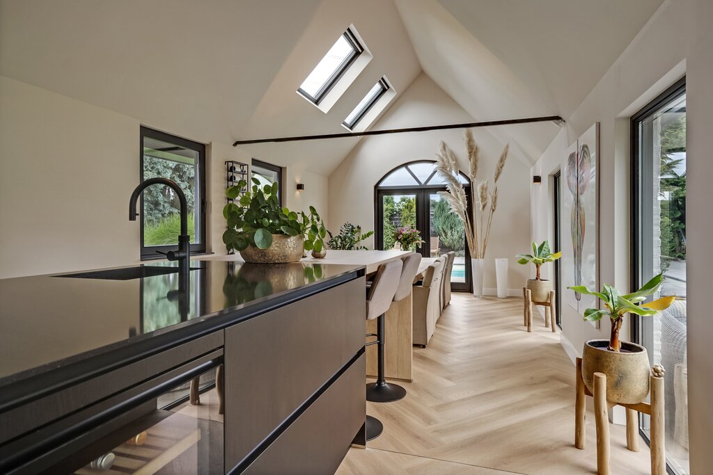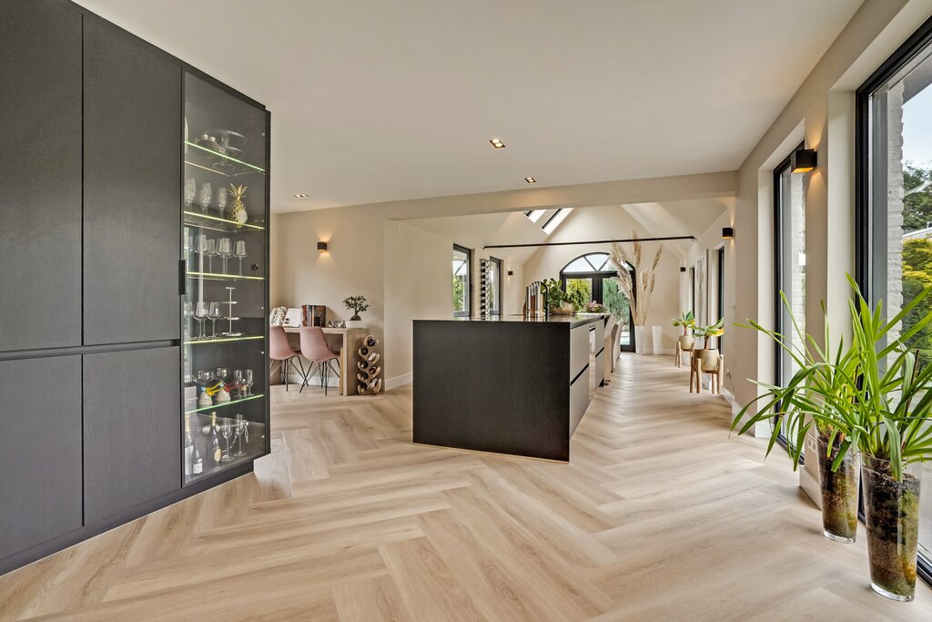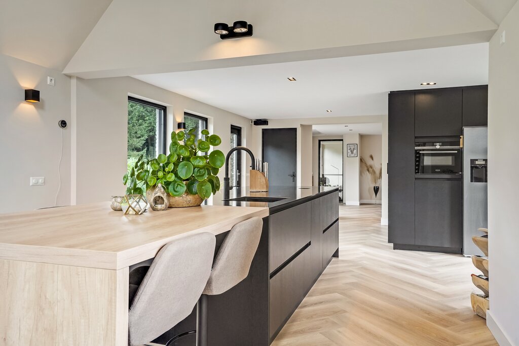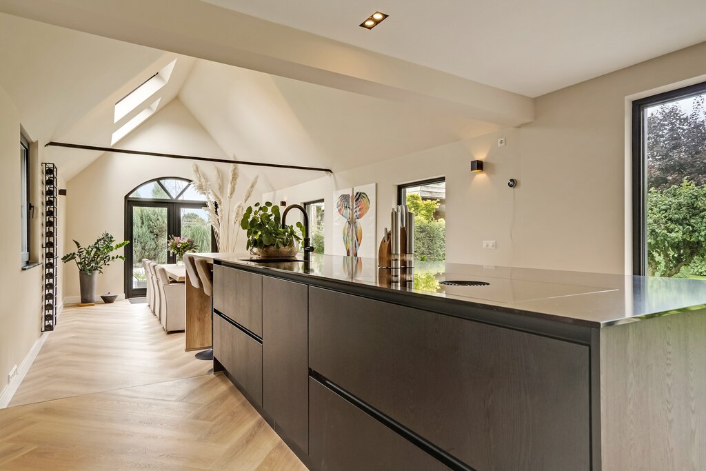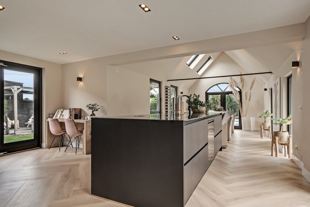 Vanuit de woonkamer valt meteen de zeer luxe en royale leefkeuken op die in 2020 ontworpen en vervaardigd is, door het exclusieve bedrijf Schalk keukens. De inrichting bestaat uit een L-vormig gedeelte met tegen de zijwand de verlichte vitrinekast, opbergkasten, grote dubbele Amerikaanse koelkast met camera’s, combimagnetron en een combi-stoomoven.