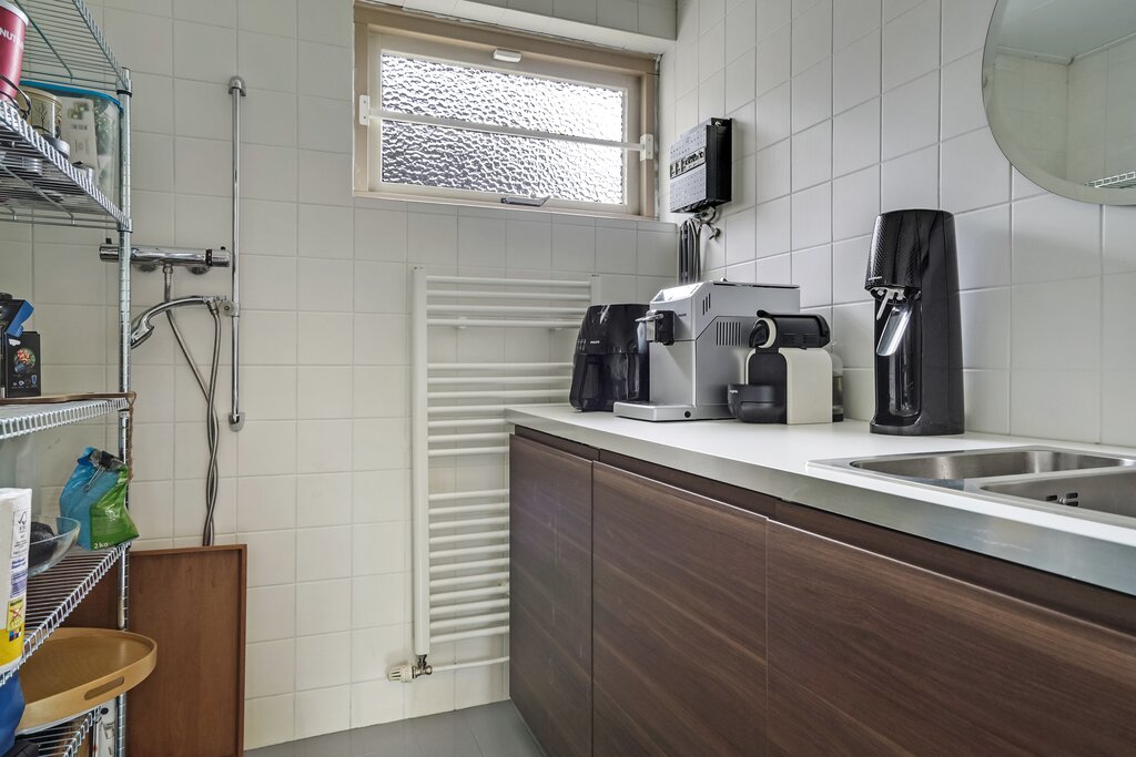 De keuken heeft aansluitend betegelde bijkeuken met een keukeninrichting voorzien van diverse ladekasten, werkblad en een rvs spoelbak.