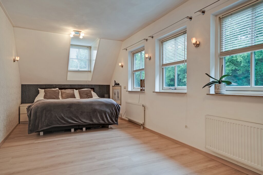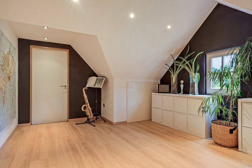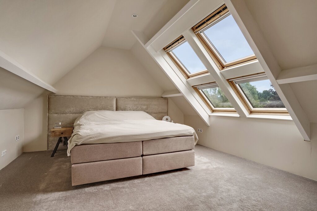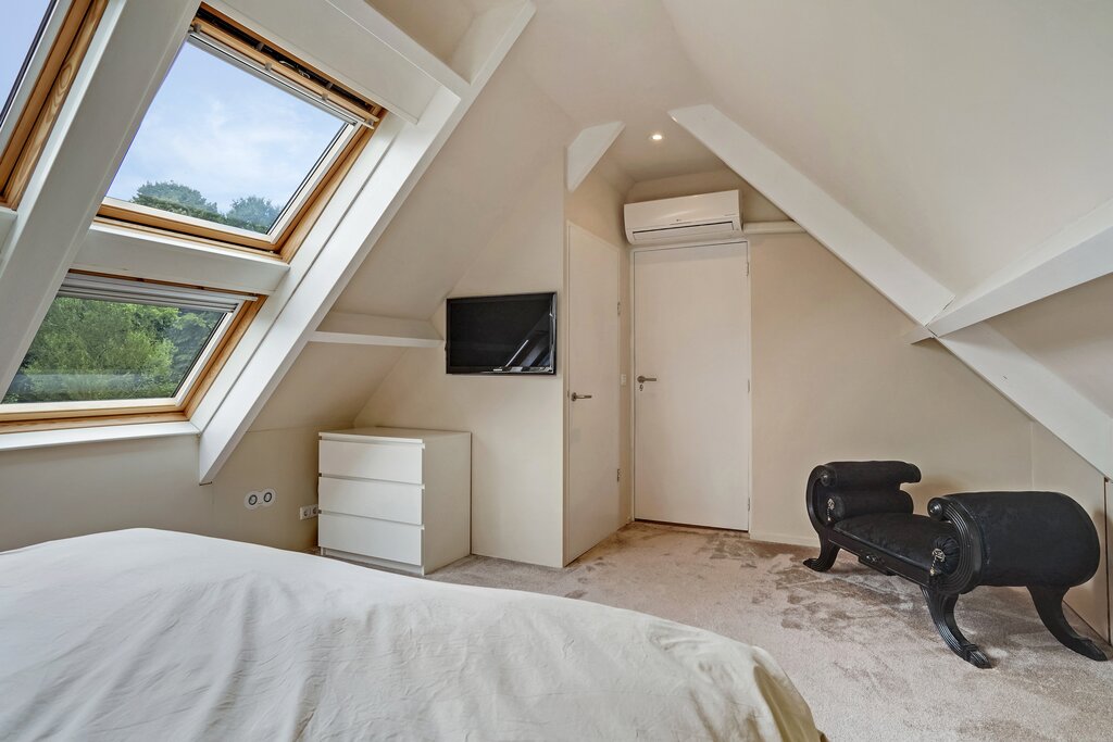 Slaapkamer 3 bevindt zich aan achterzijde betreft de Master bedroom met 4 grote Velux dakramen die uitzicht biedt op, de onder architectuur ingerichte tuin. Verder vindt u in deze kamer een airco unit en bergkasten. De kamer is afgewerkt met vloerbedekking en gestukadoorde wanden en -plafond met inbouwverlichting.