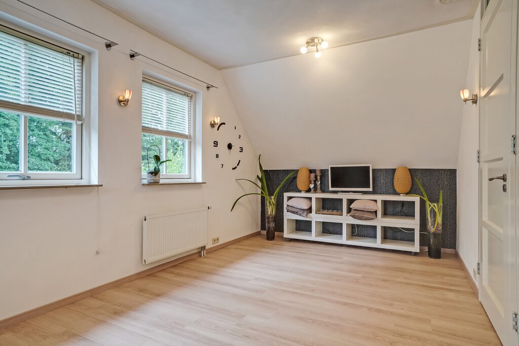 Tegenover deze ruimten ligt de slaapkamer 2 die is afgewerkt met een laminaatvloer, gestukadoorde wanden en een stucwerk plafond. Deze 2e slaapkamer heeft 2 dakkappelletjes die voor licht en sfeer zorgen.