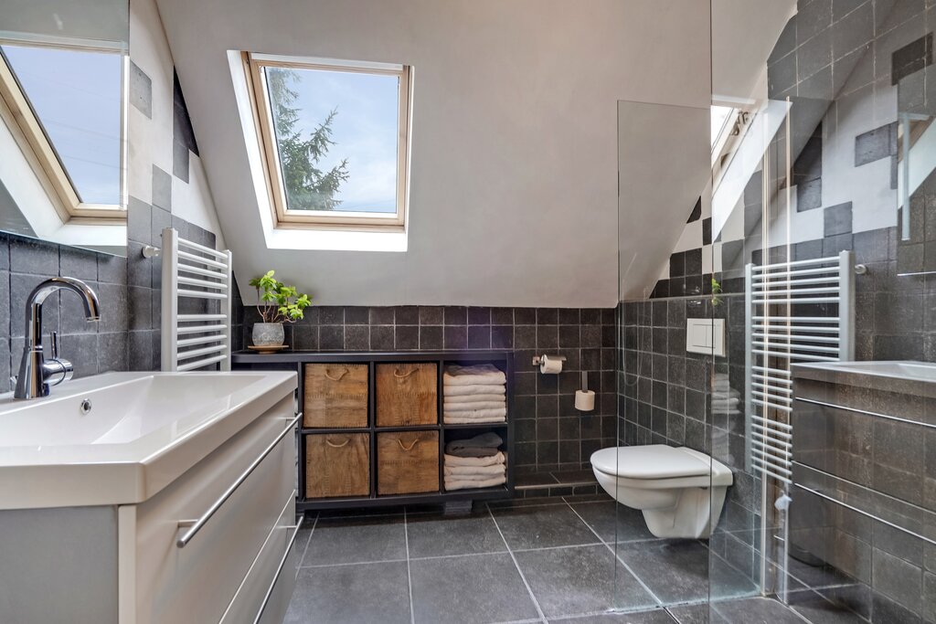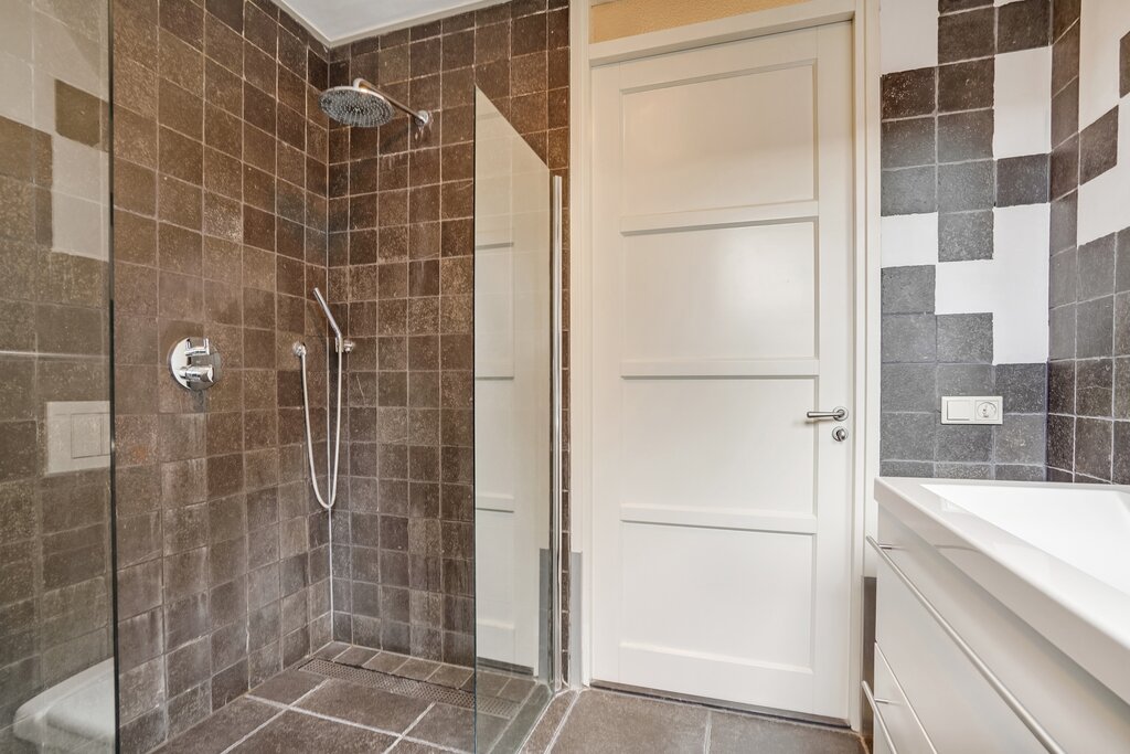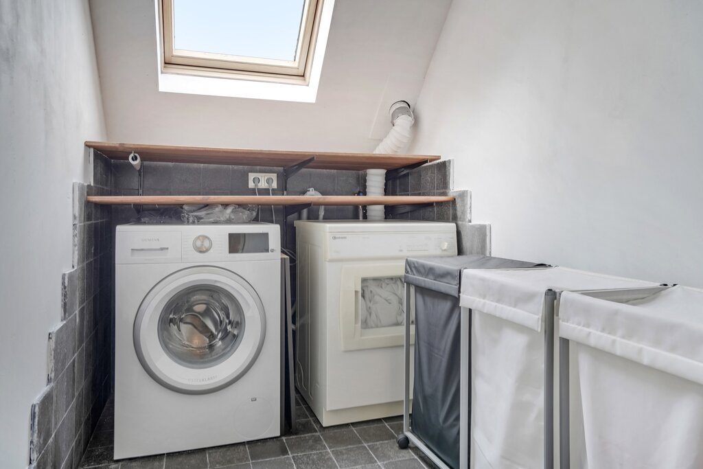 Door de overloop lopend komt u de eigentijdse fraai afgewerkte betegelde badkamer. Deze badkamer heeft een Velux dakraam en is voorzien van een badmeubel met wastafel, zwevend toilet met muurspoeling, design radiator en een inloopdouche met een glazen scheidingswand, ingebouwde thermostaatkraan, regen- en handdouche. Hiernaast ligt de deels betegelde wasruimte, inclusief Velux dakraam en met de bijbehorende aansluitingen t.b.v. wasapparatuur.