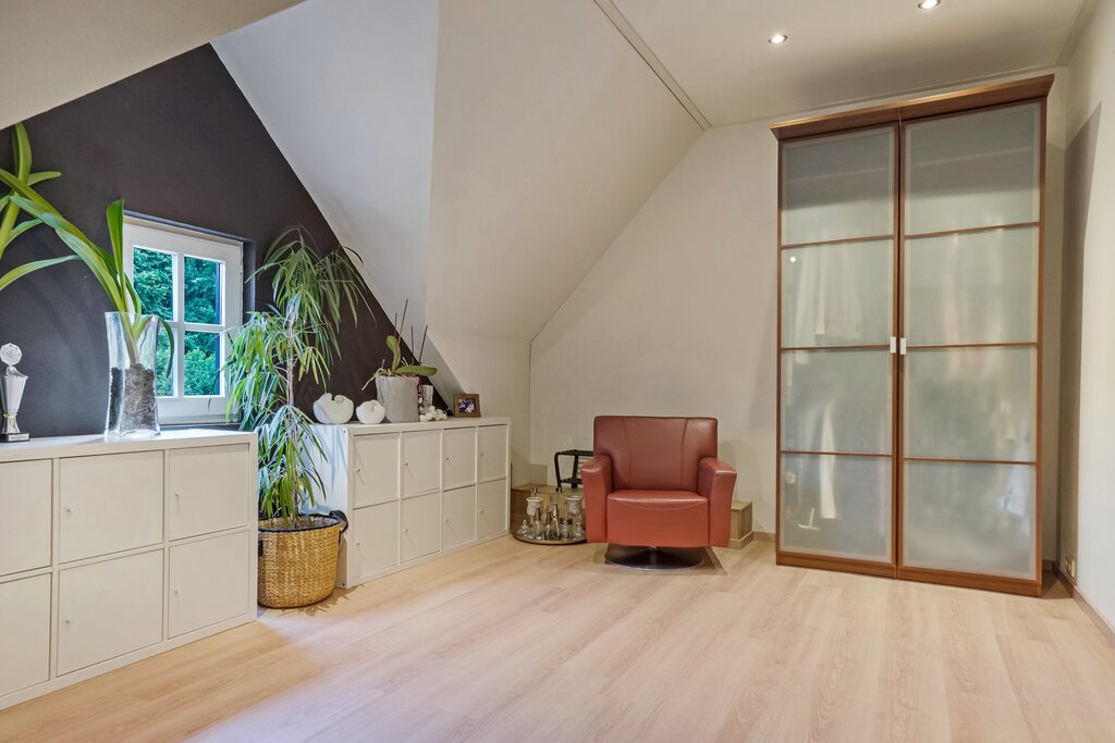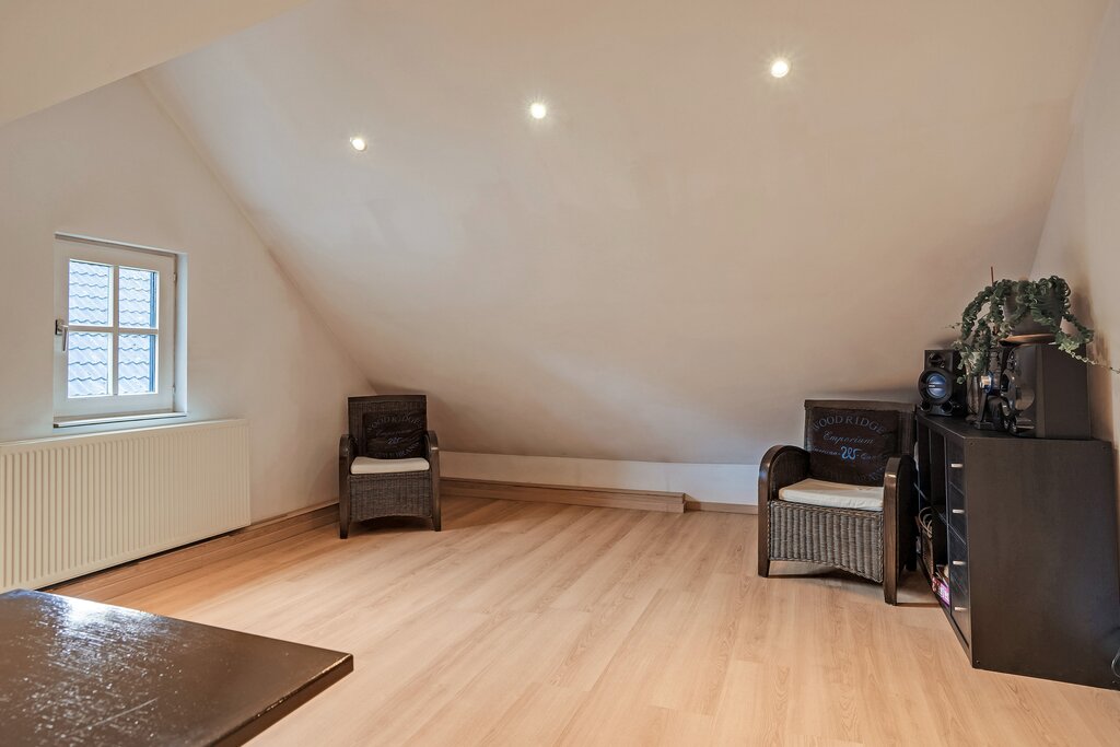 In het tweede deel van de woonkamer vindt u ruimte voor een grote zithoek. Hier zit ook nog een voormalig trappengat die simpel weer in gebruik genomen zou kunnen worden. Ook hier vindt u de recent volledig vernieuwde meterkast voor het achterste deel van het huis.