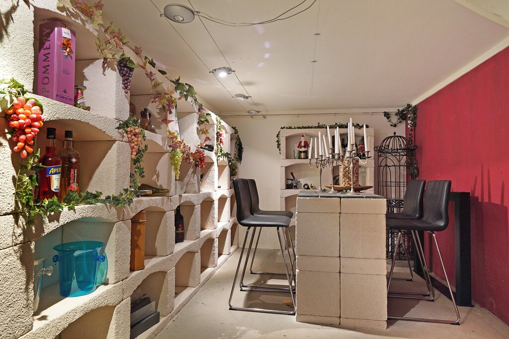 Via de woonkamer komt u via de opkamer in de sport/speelkamer (voorheen garage) die ook de deur herbergt naar de royale wijnkelder 6.00 x 2.80 meter. In de sport/speelkamer ligt een laminaatvloer en bevindt zich ook de omvormer voor de aanwezige 41 zonnepanelen.