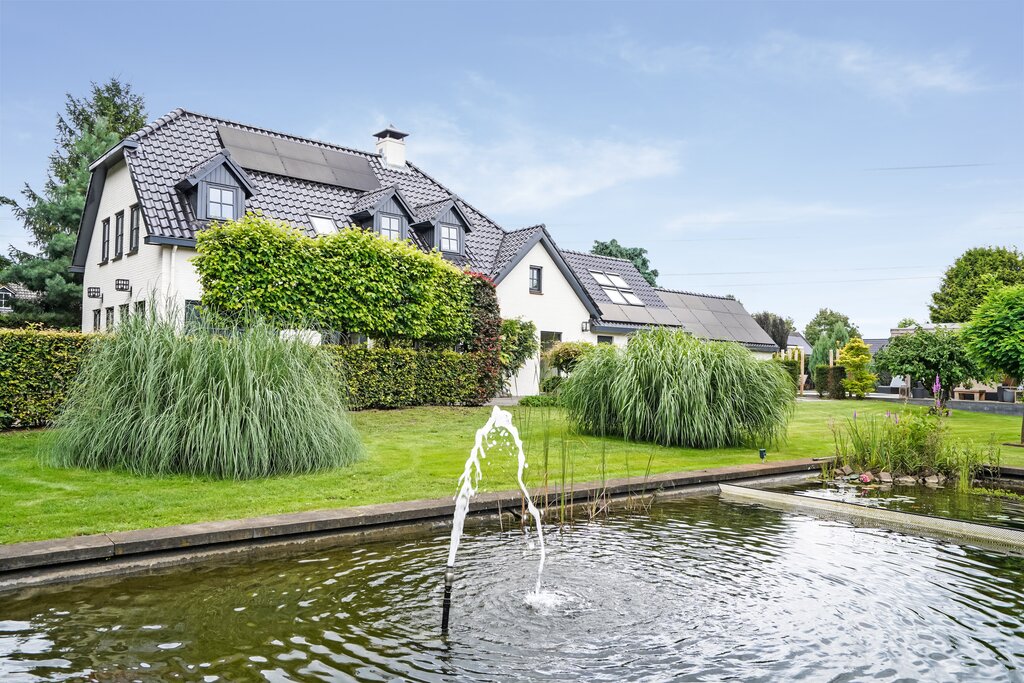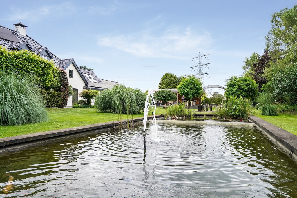 De tuin kenmerkt zich door een fraaie vijverpartij van 16.00 x 6.00 meter die ingericht is speciaal voor Koi karpers middels een scheidingswand en met een fontein die gezellig een spetterende geluid geeft. De beplanting is ingericht op kleur en seizoenen waardoor ieder moment wel een eye-catcher te vinden is maar ook een groene basis geeft, het hele jaar door.