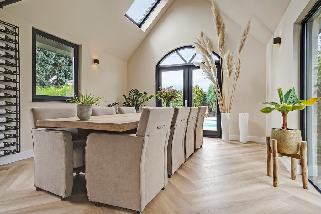 Aansluitend aan het composieten blad is er een bar geplaatst waar je makkelijk met 4 personen kan zitten. Hierachter nog een ruim eetgedeelte waar met gemak een tafel van 3.00 meter kan staan en zicht heeft op het fraaie zwembad en de tuin.