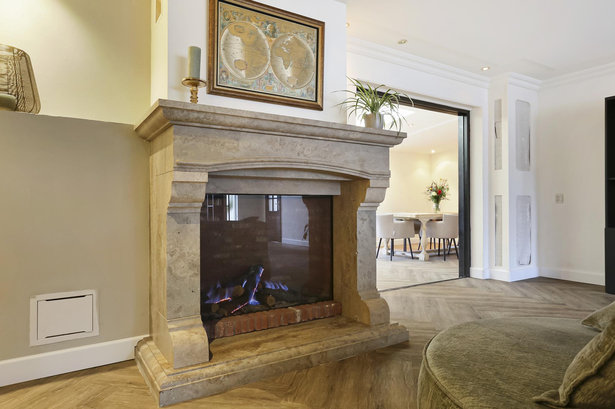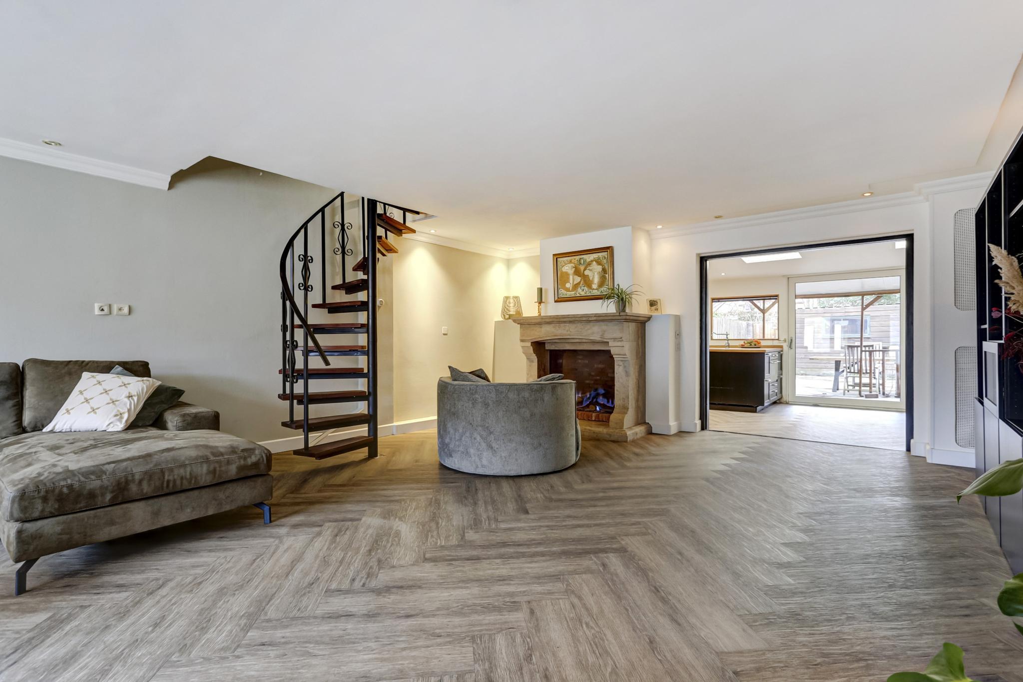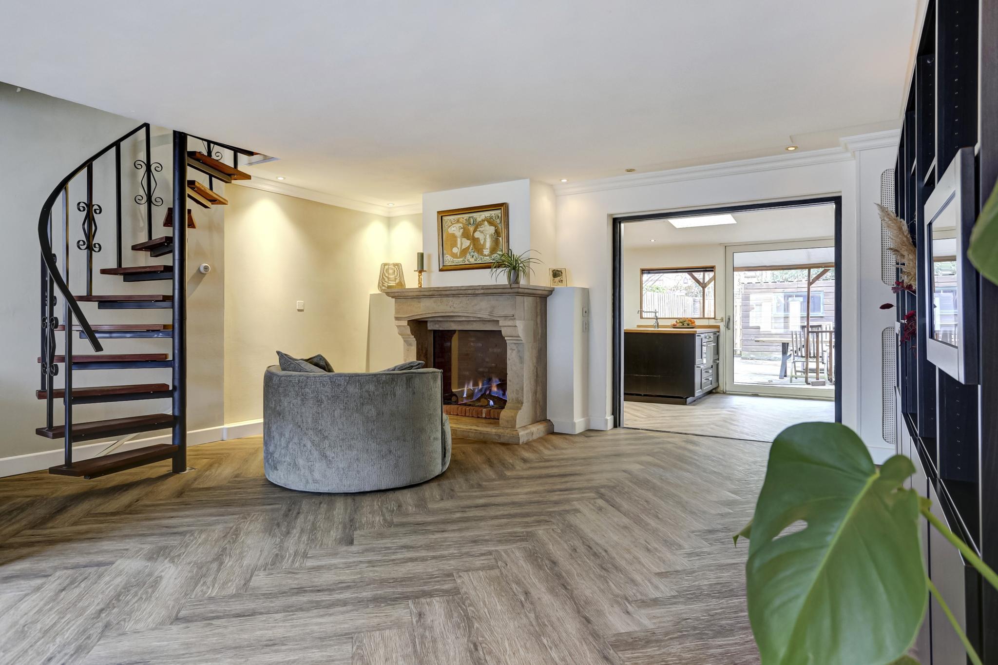 Ruime living met een sfeervolle gesloten gashaard en de kamer is afgewerkt met een in visgraat gelegde pvc vloer, behangen wanden en een stucwerk plafond voorzien van inbouwverlichting.