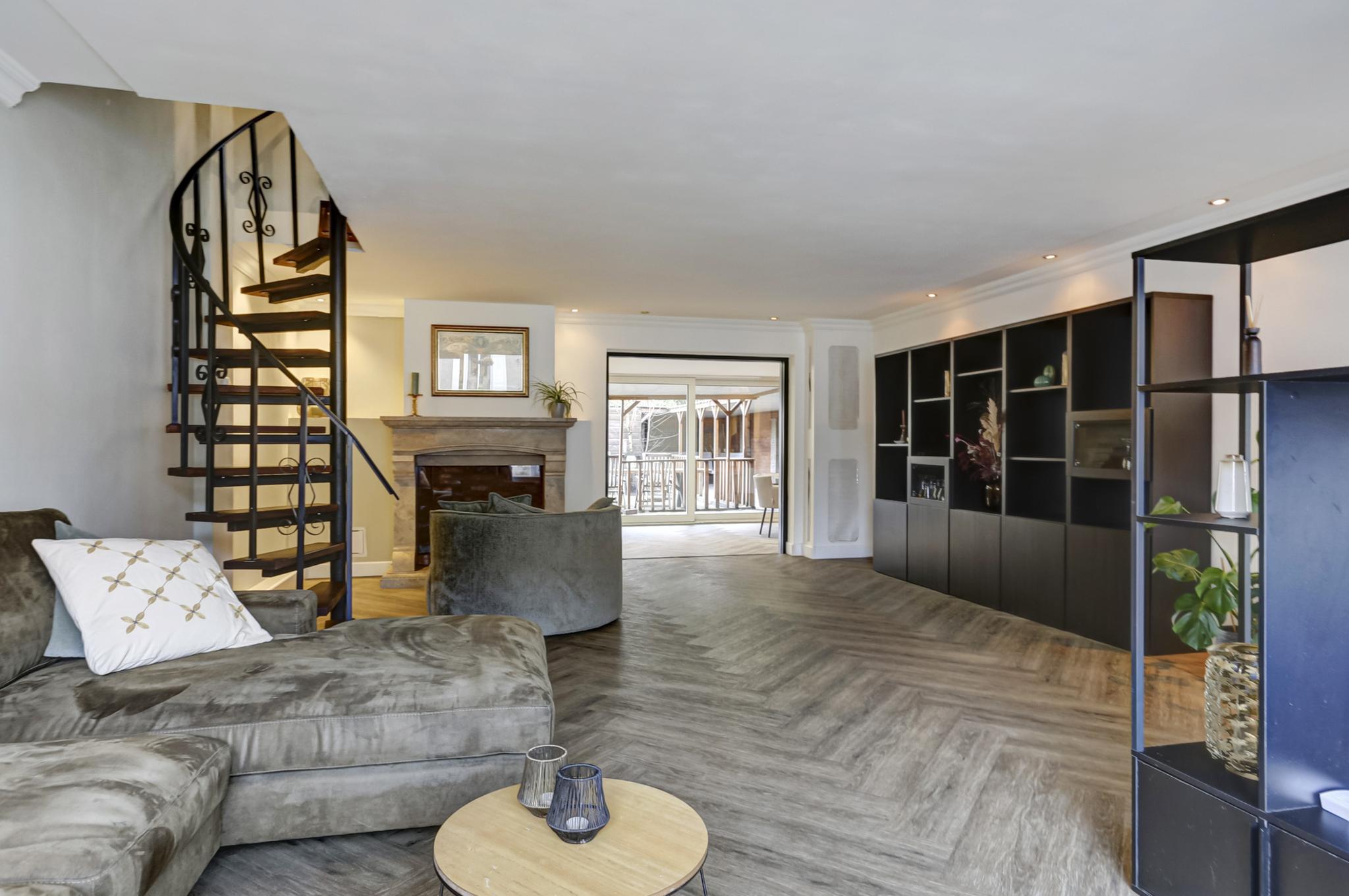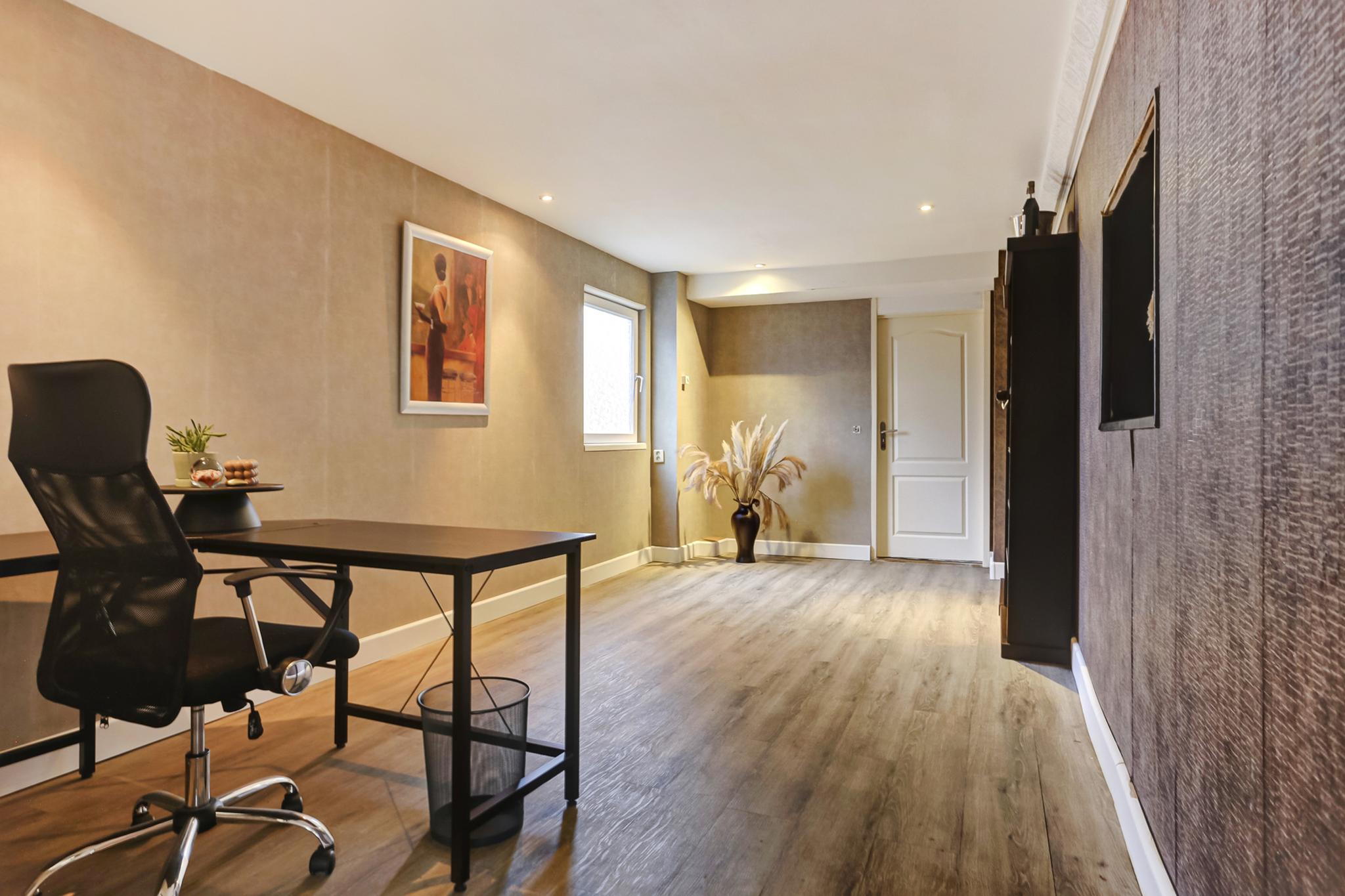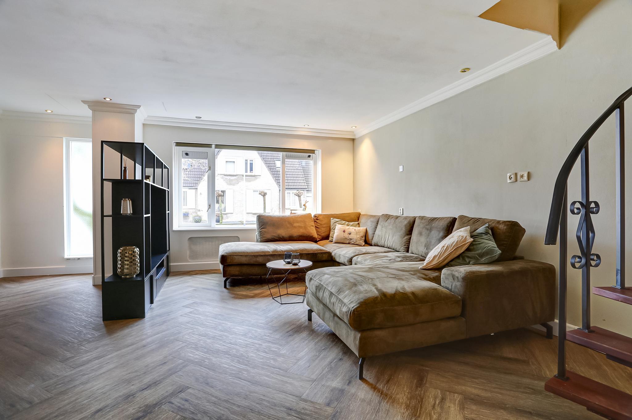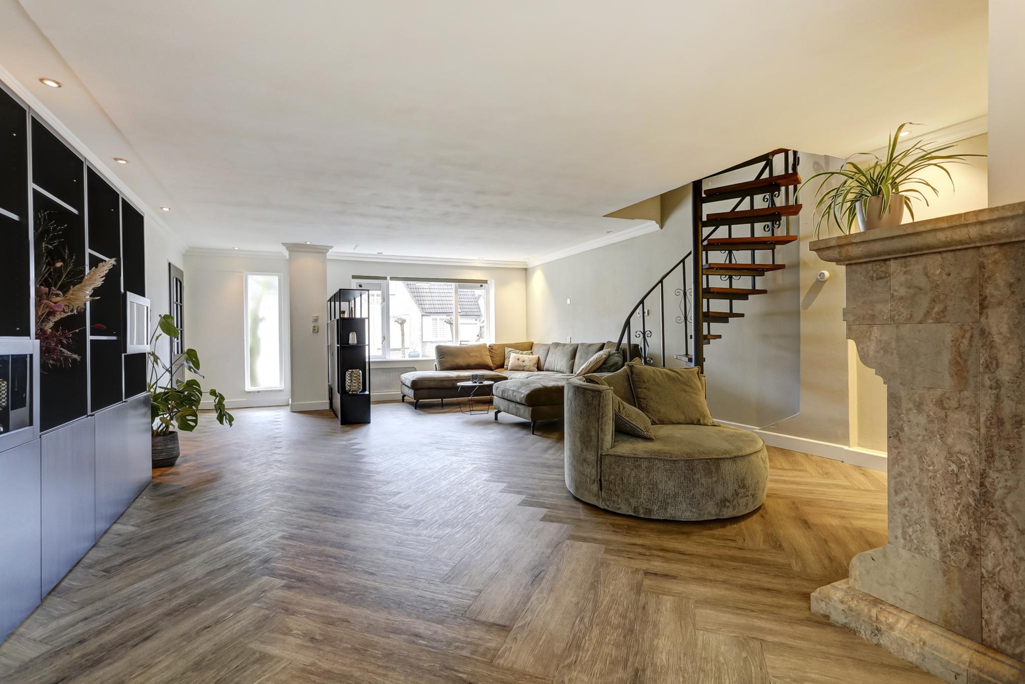 Ruime living met een sfeervolle gesloten gashaard en de kamer is afgewerkt met een in visgraat gelegde pvc vloer, behangen wanden en een stucwerk plafond voorzien van inbouwverlichting.