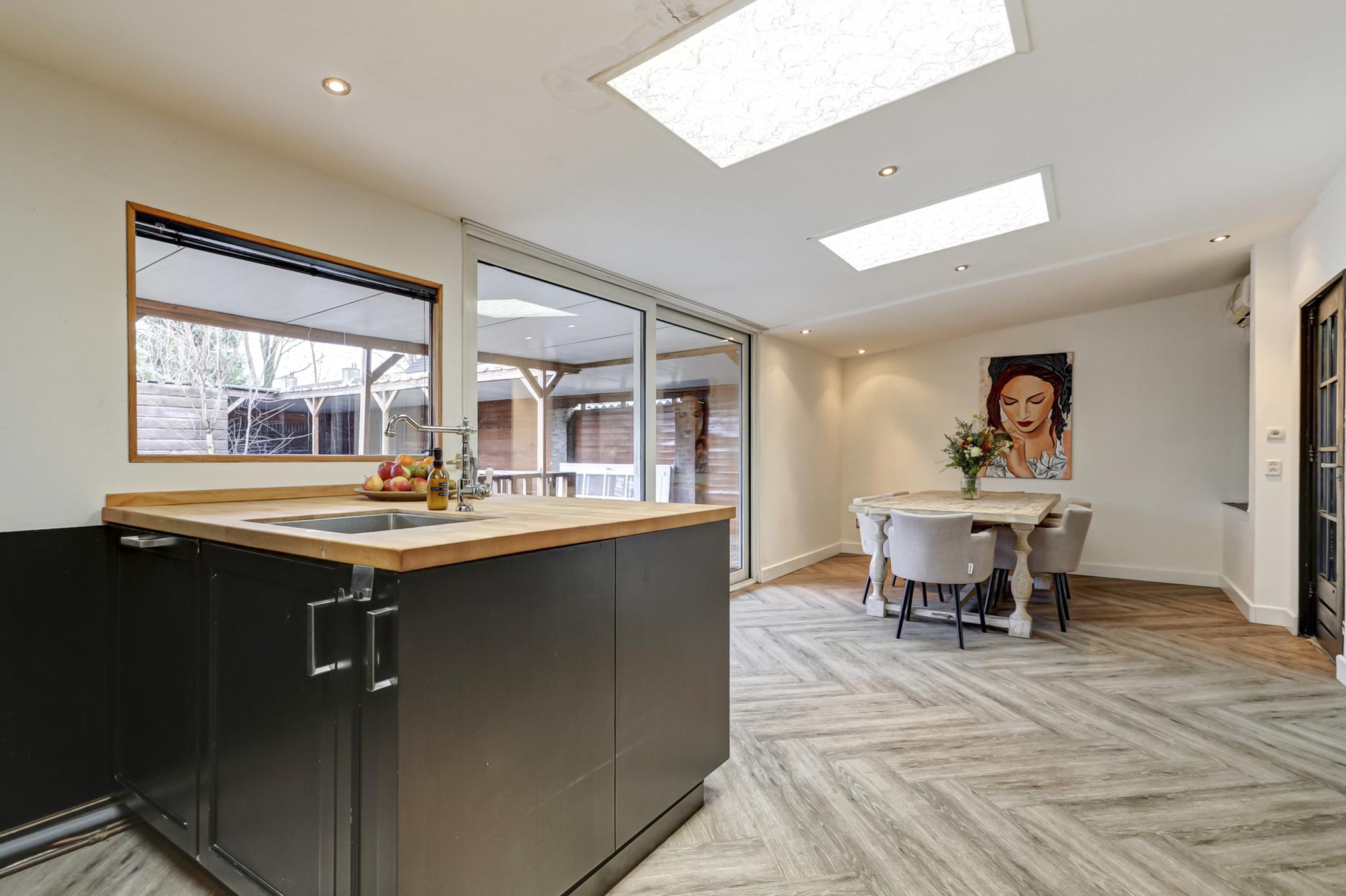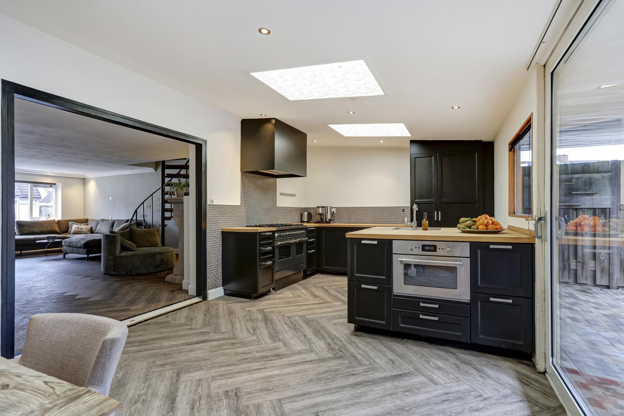 De woonkeuken in de uitbouw is voorzien van een complete nette keukeninrichting met een spoeleiland en ingericht met diverse laden en kasten, 6-pits gaskookplaat, afzuigkap, koelkast, vaatwasmachine, oven/magnetron combinatie en een rvs spoelbak.