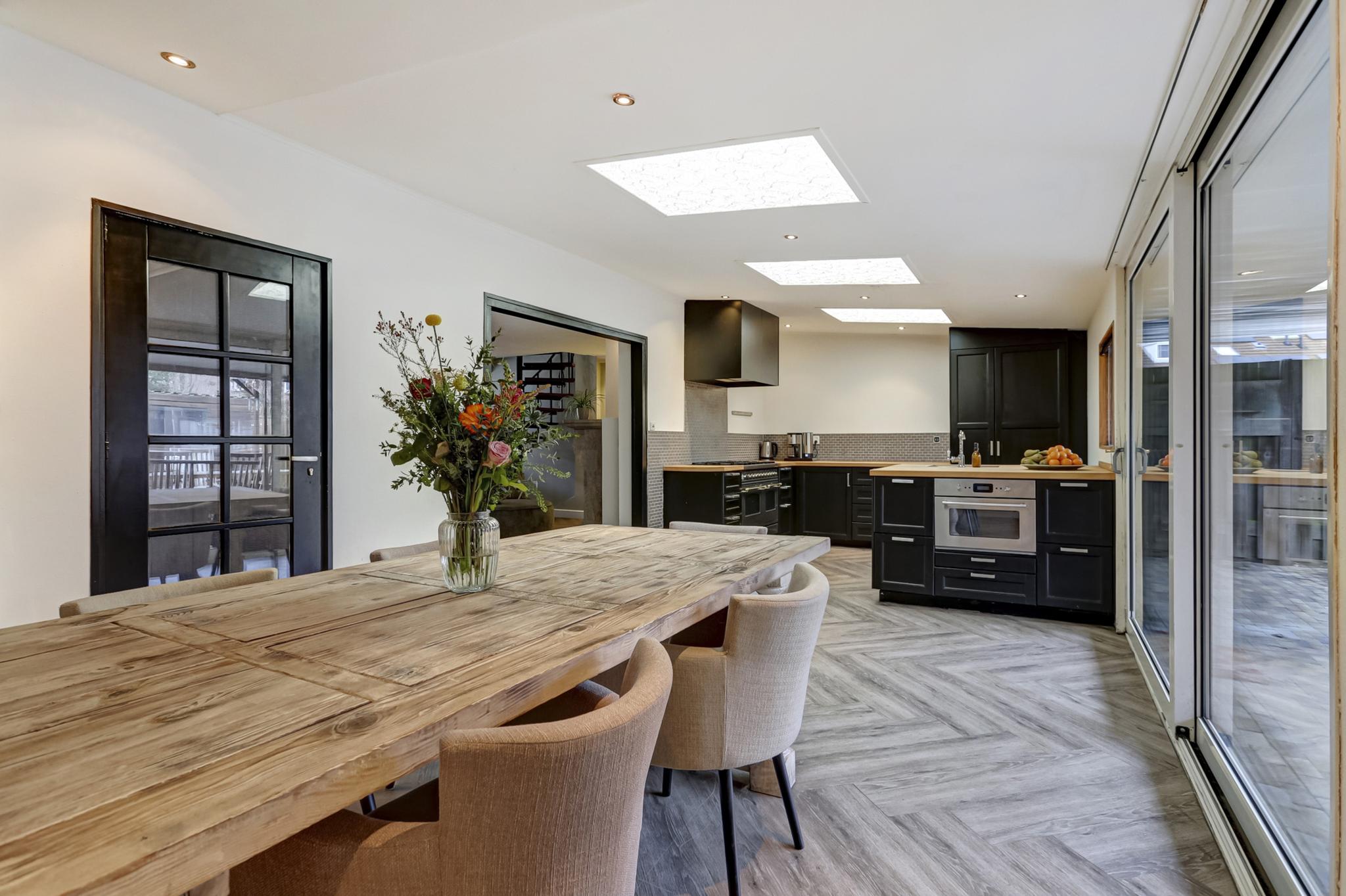 Deze ruimte is nu ingericht met de keukeninrichting en een eetgedeelte.