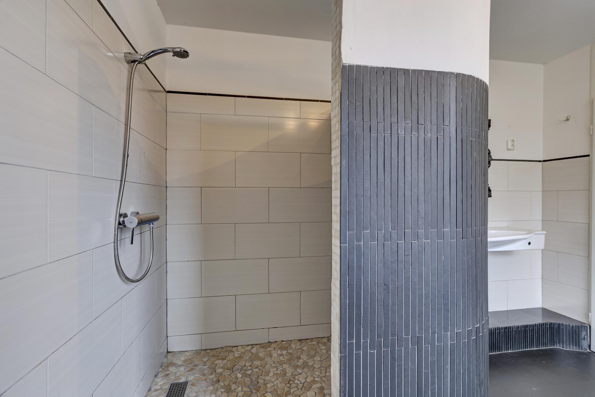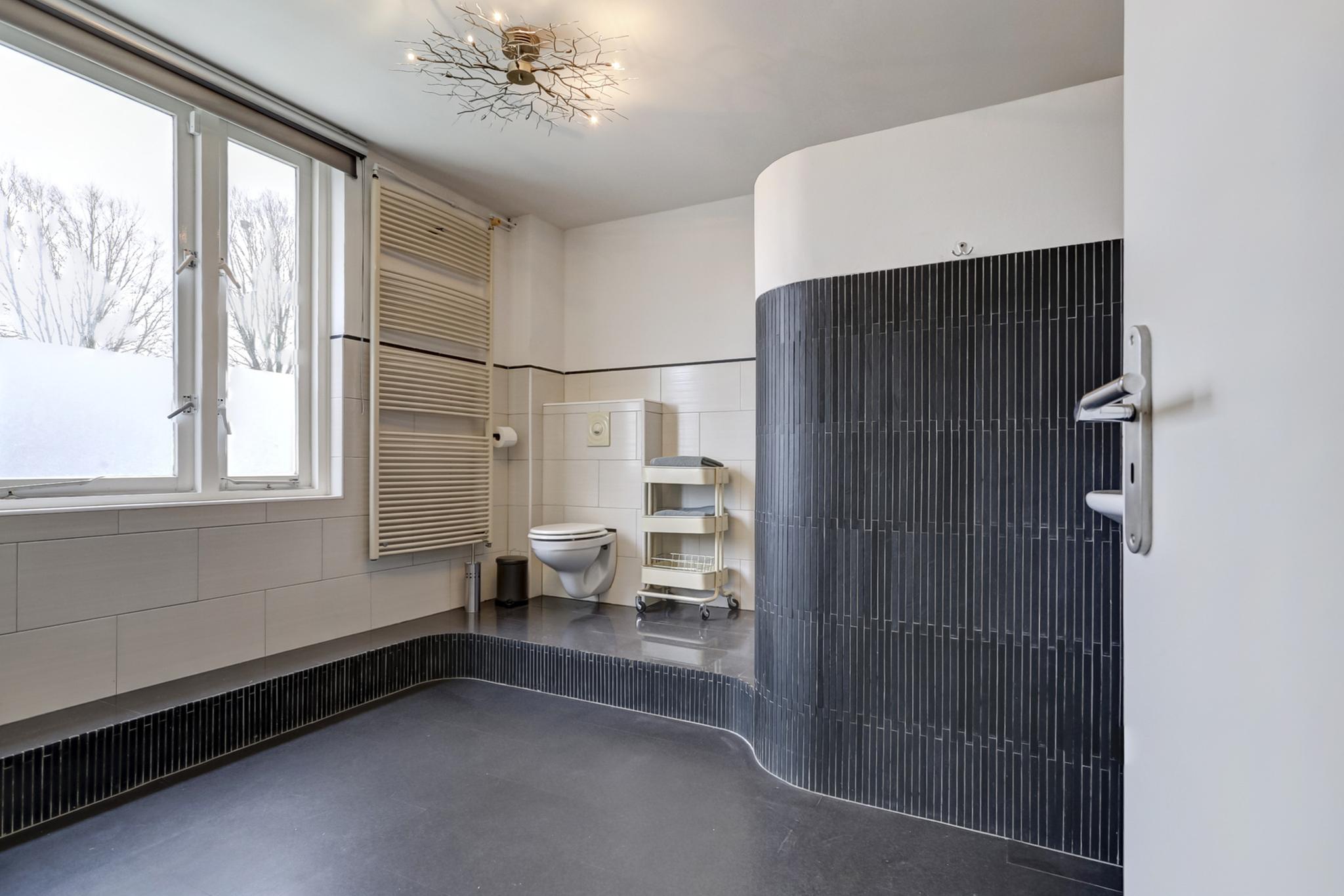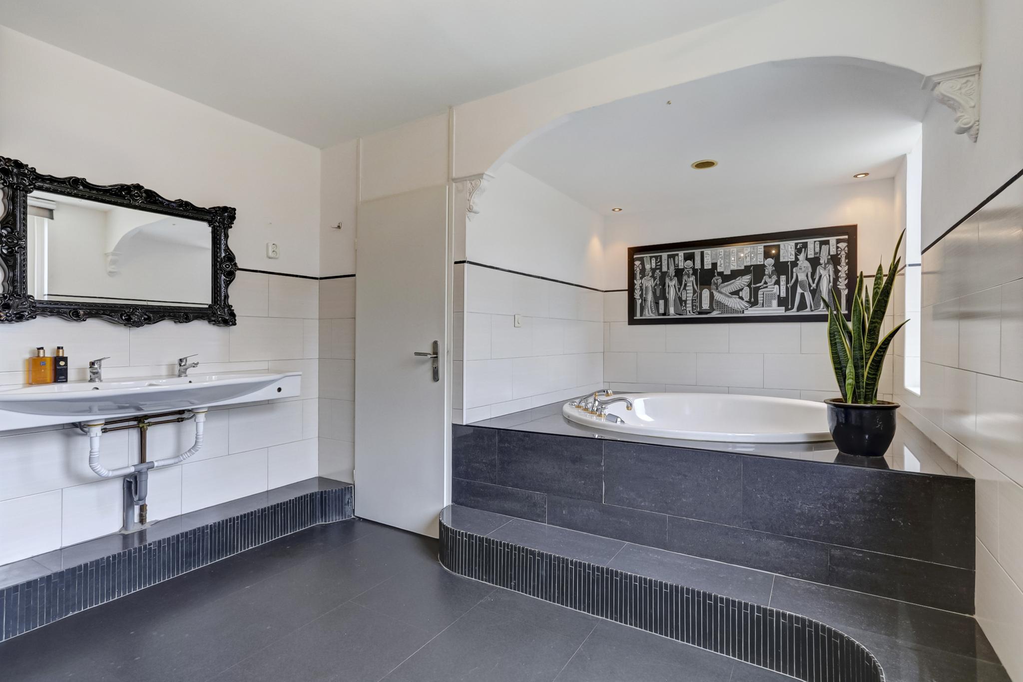 De royale deels betegelde badkamer is voorzien van een dubbele wastafel, inloopdouche met thermostaatkraan, zwevend closet en een kunststof rond bad met jetstream functie.