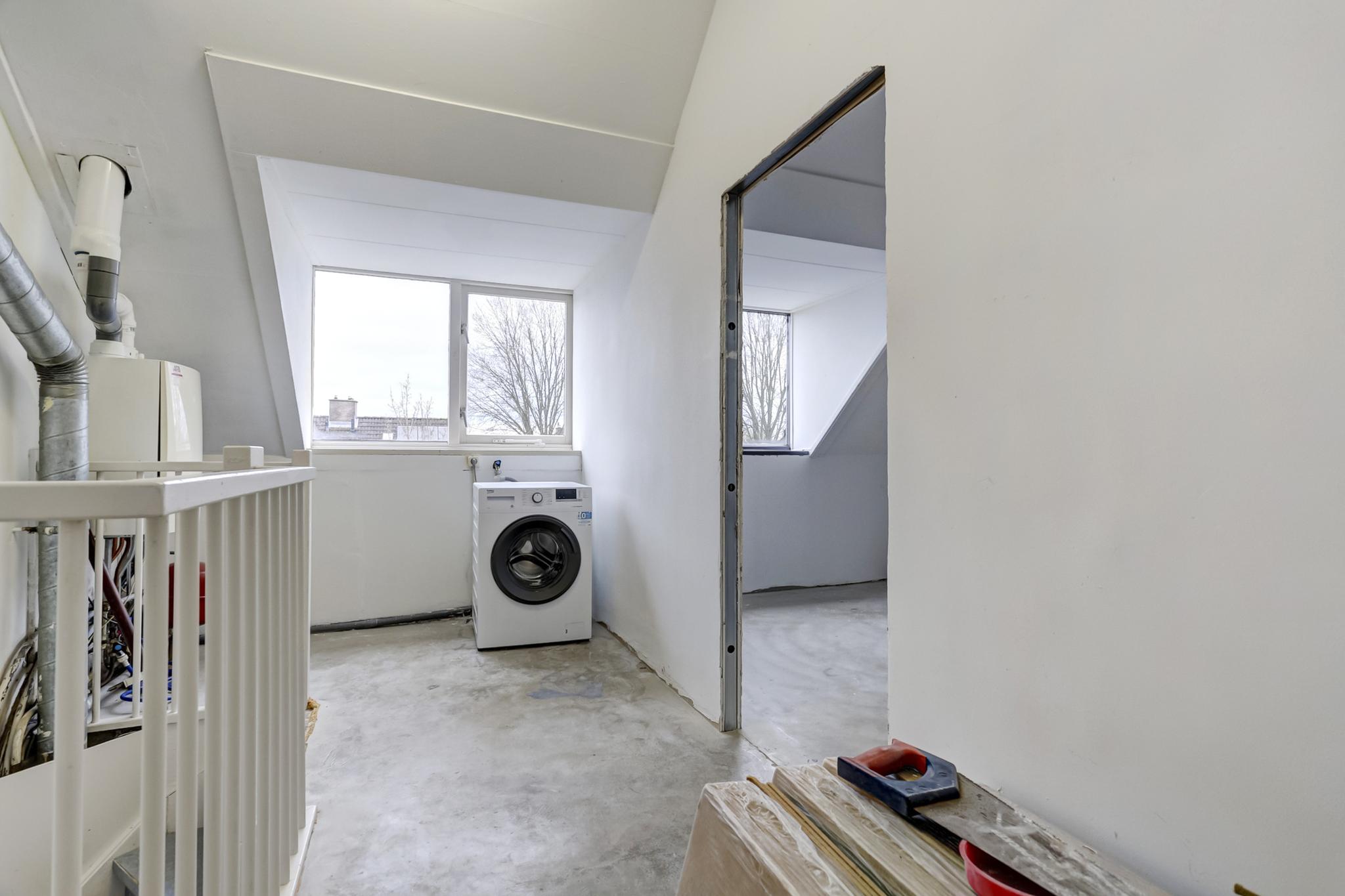 Voorzolder met de aansluiting t.b.v. wasapparatuur, unit mechanische ventilatie en de opstelling van de HR c.v. combiketel van het merk Remeha Callenta uit 2013.
