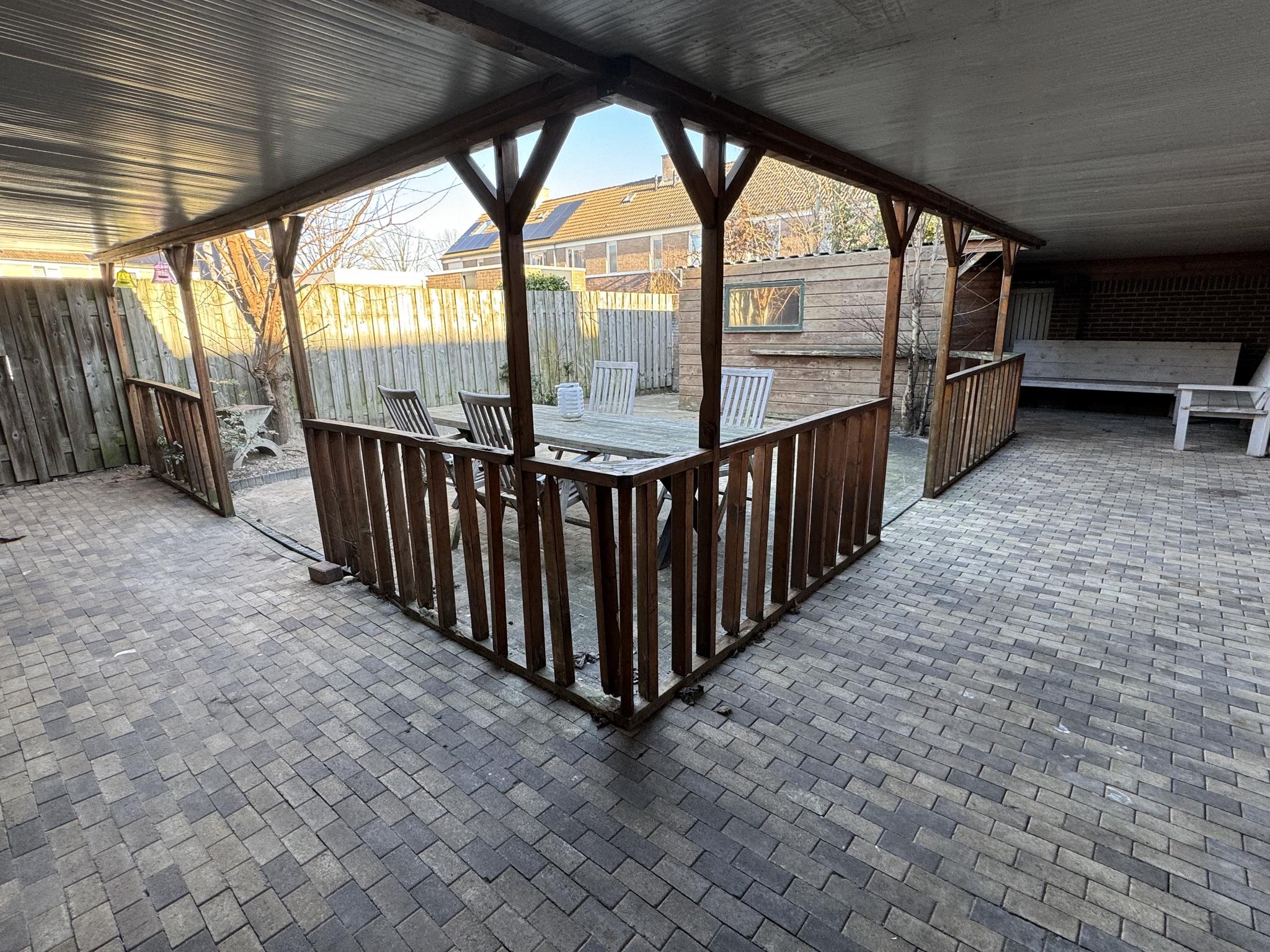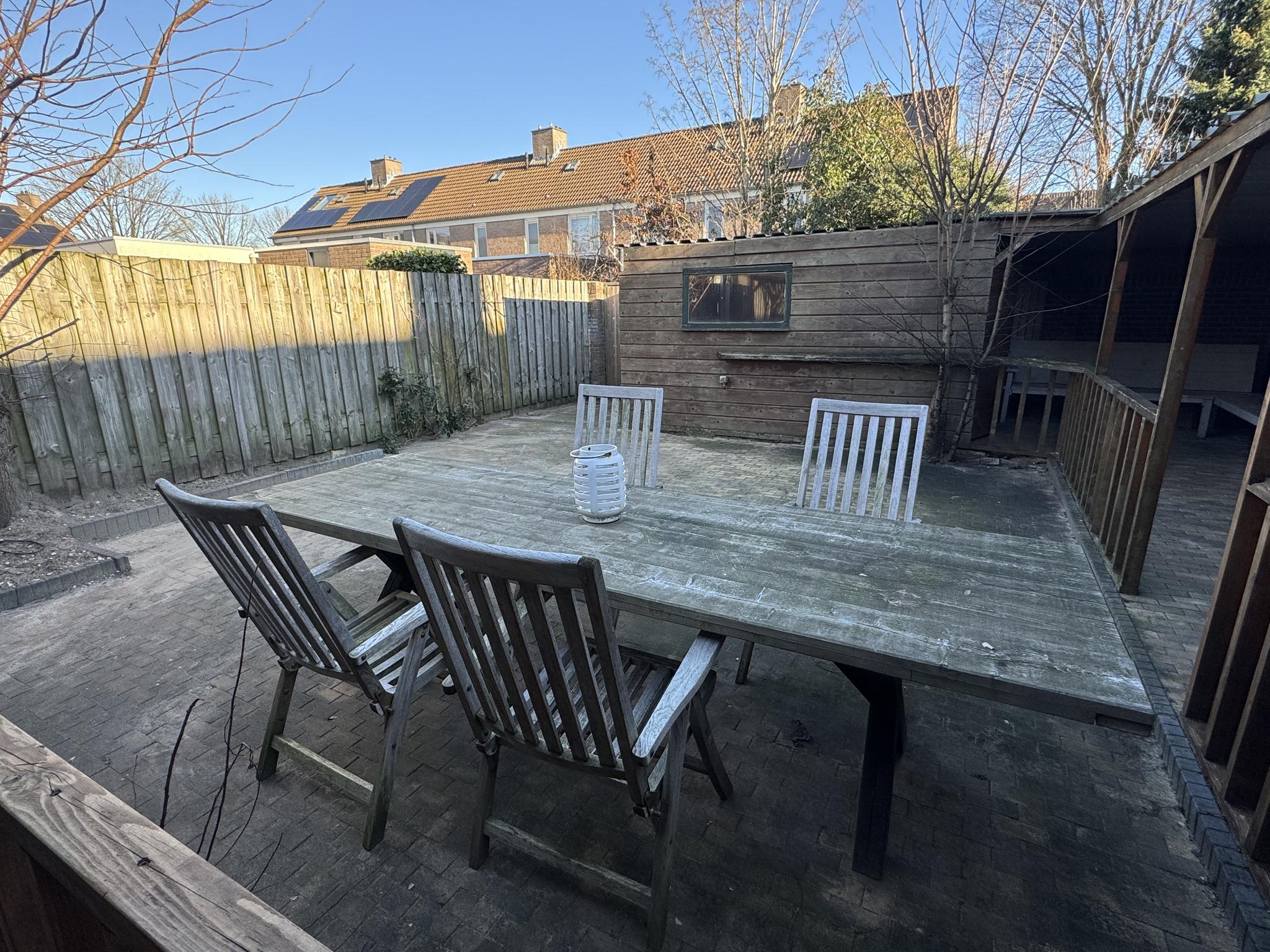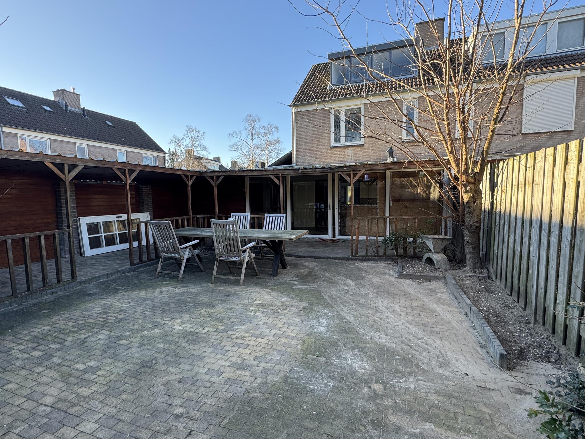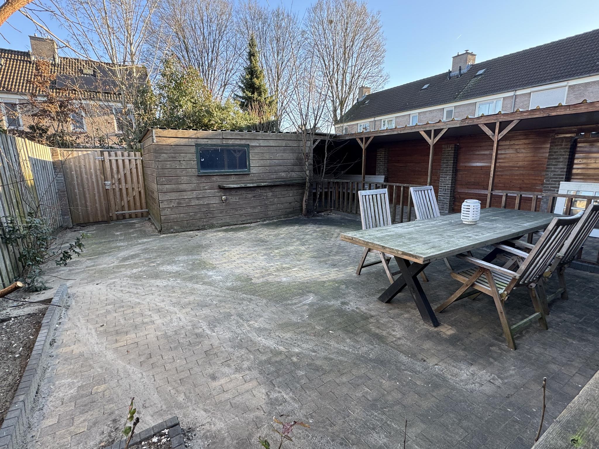 De gezellige achtertuin met een afsluitbare achterom en toegang tot berging, welke deels is overkapt met een houten veranda en aangelegd met sierbestrating en beplanting.
