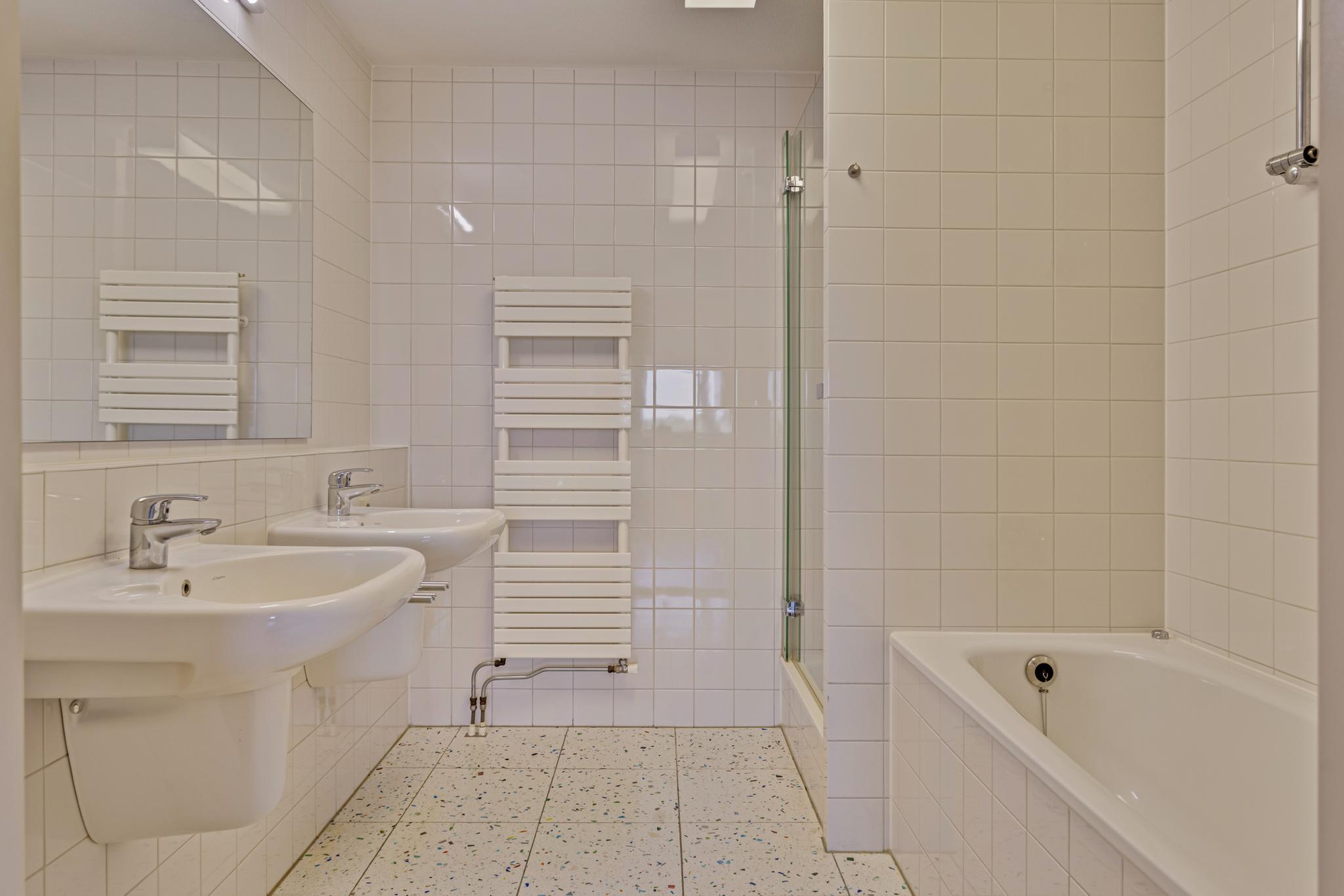 De ruime betegelde badkamer is voorzien van een separate douche, ligbad, design radiator en een dubbele wastafel.
