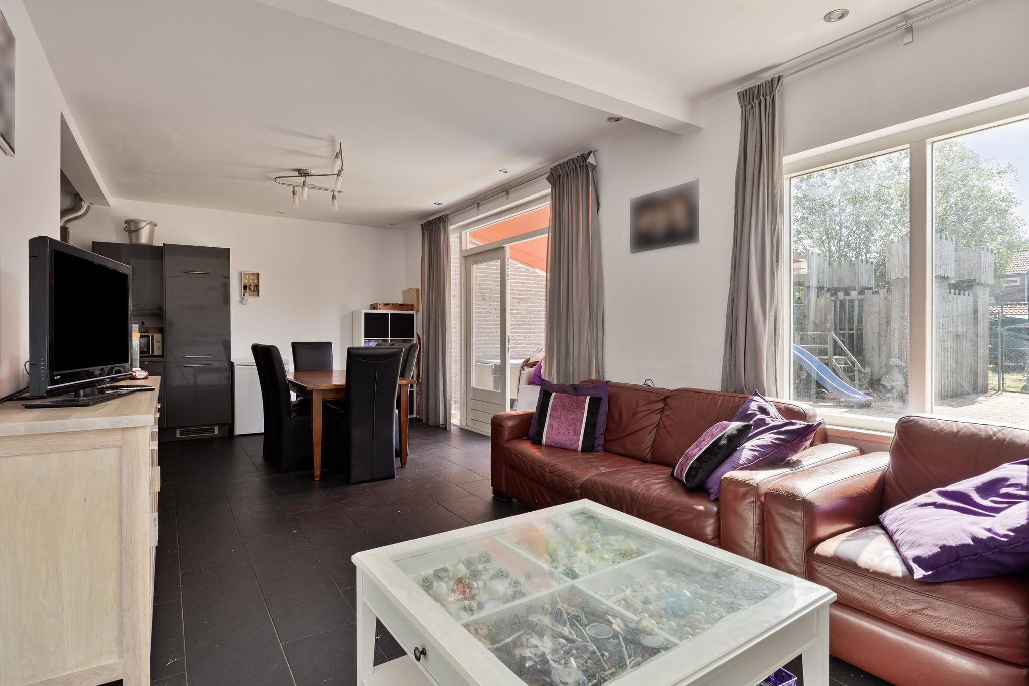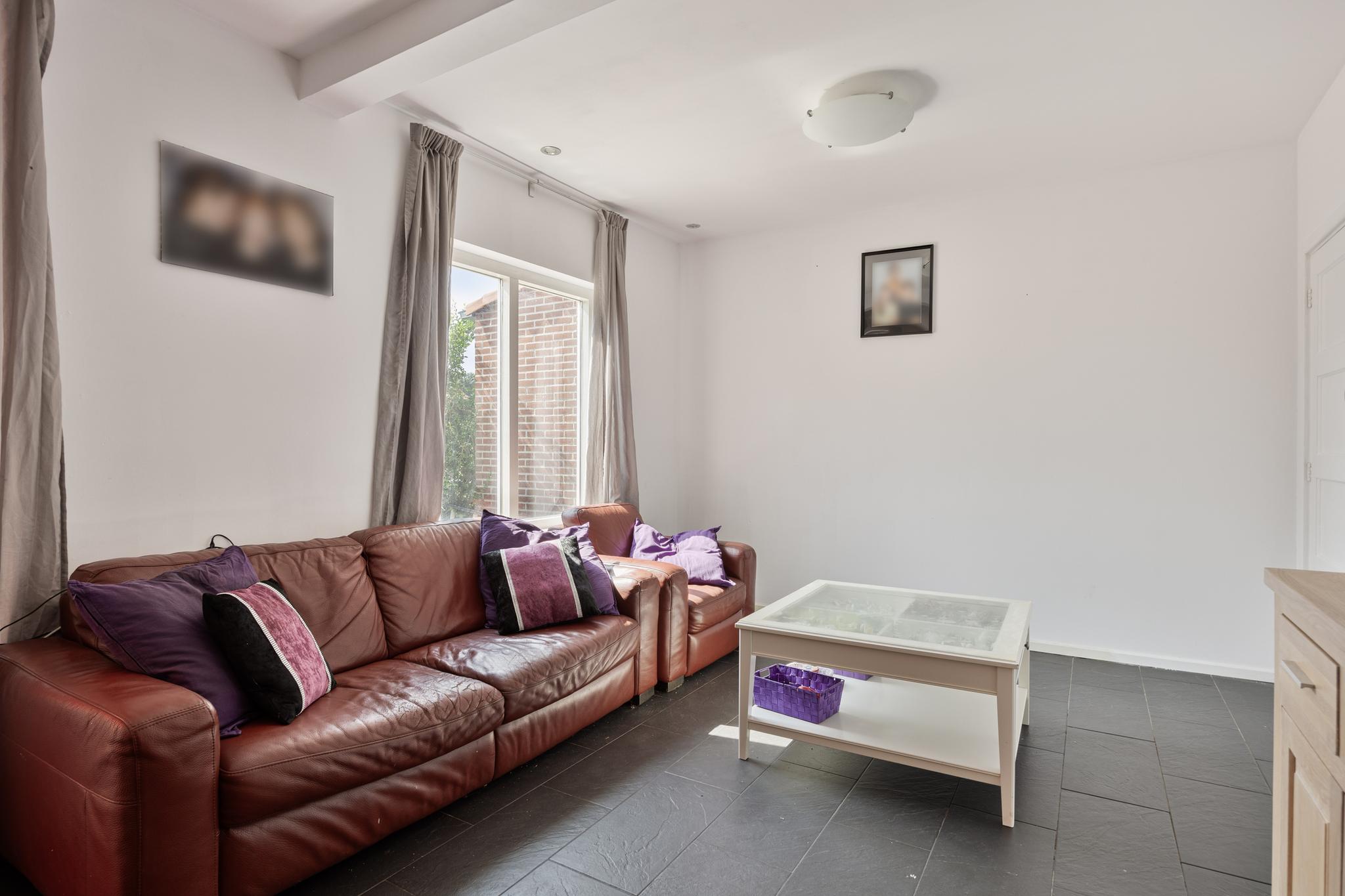 De woonkamer is afgewerkt met een tegelvloer, stucwerk wanden en een stucwerk plafond.
