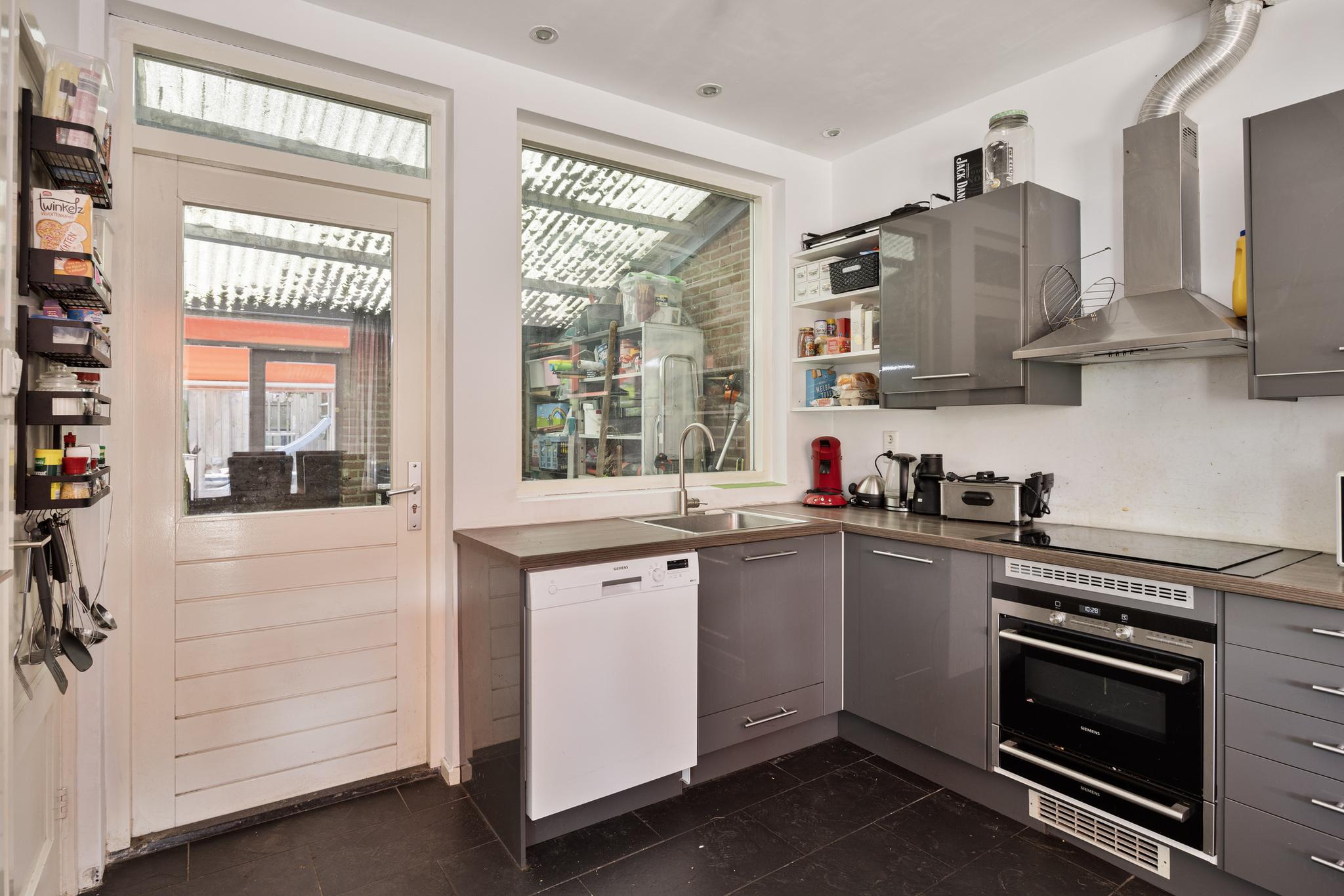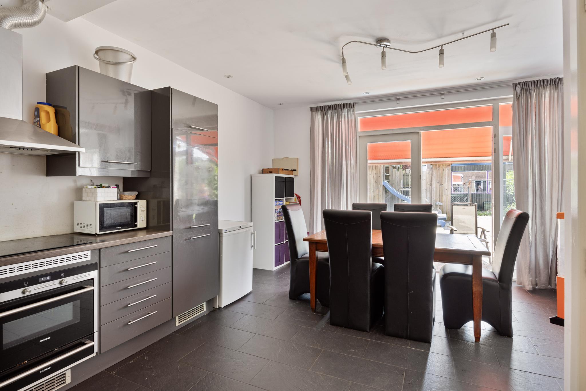 Open keuken met een keukeninrichting in hoekopstelling voorzien van diverse laden en kasten, kunststof werkblad, koel/vries combinatie, inductie kookplaat, afzuigkap, elektrische oven, vaatwasmachine en een rvs spoelbak.