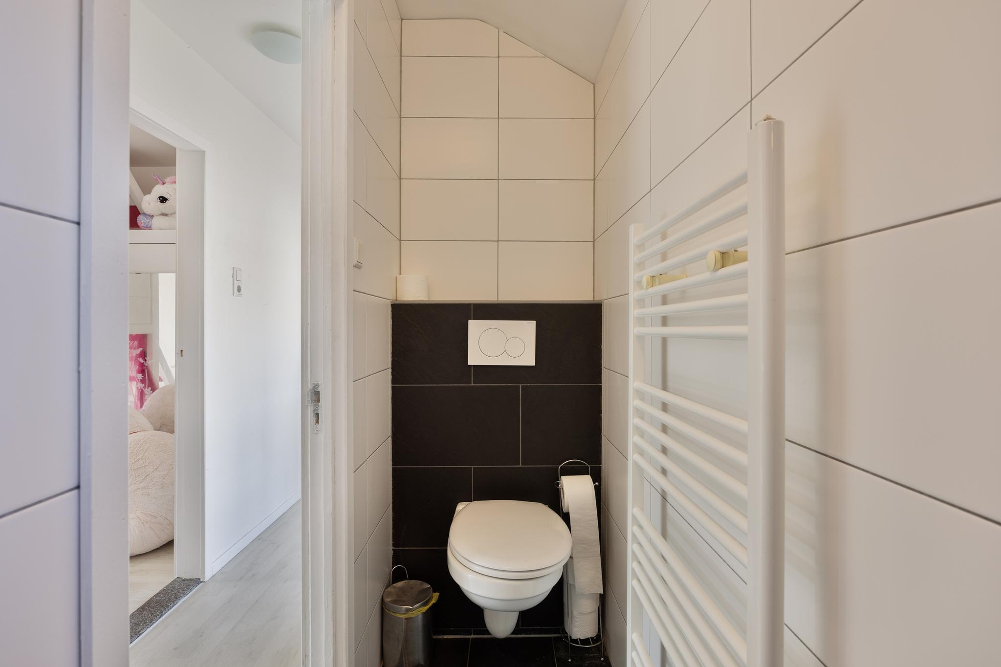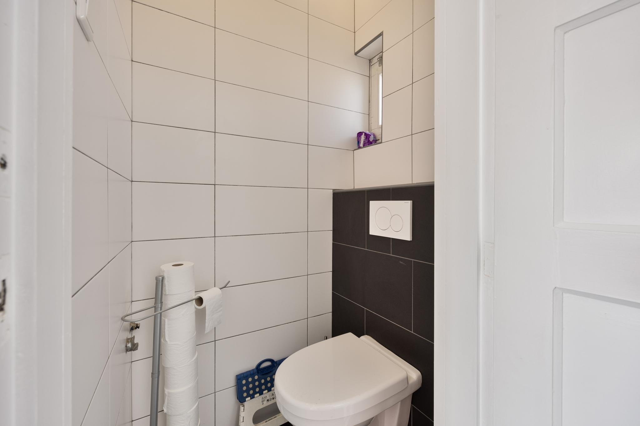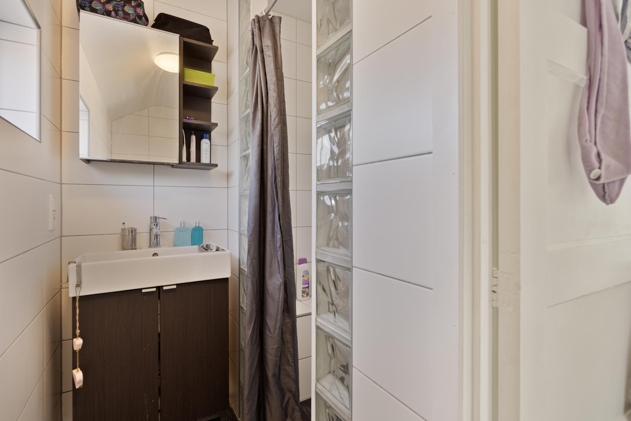 Betegelde badkamer voorzien van een inloopdouche, wastafel en een 2e toilet.