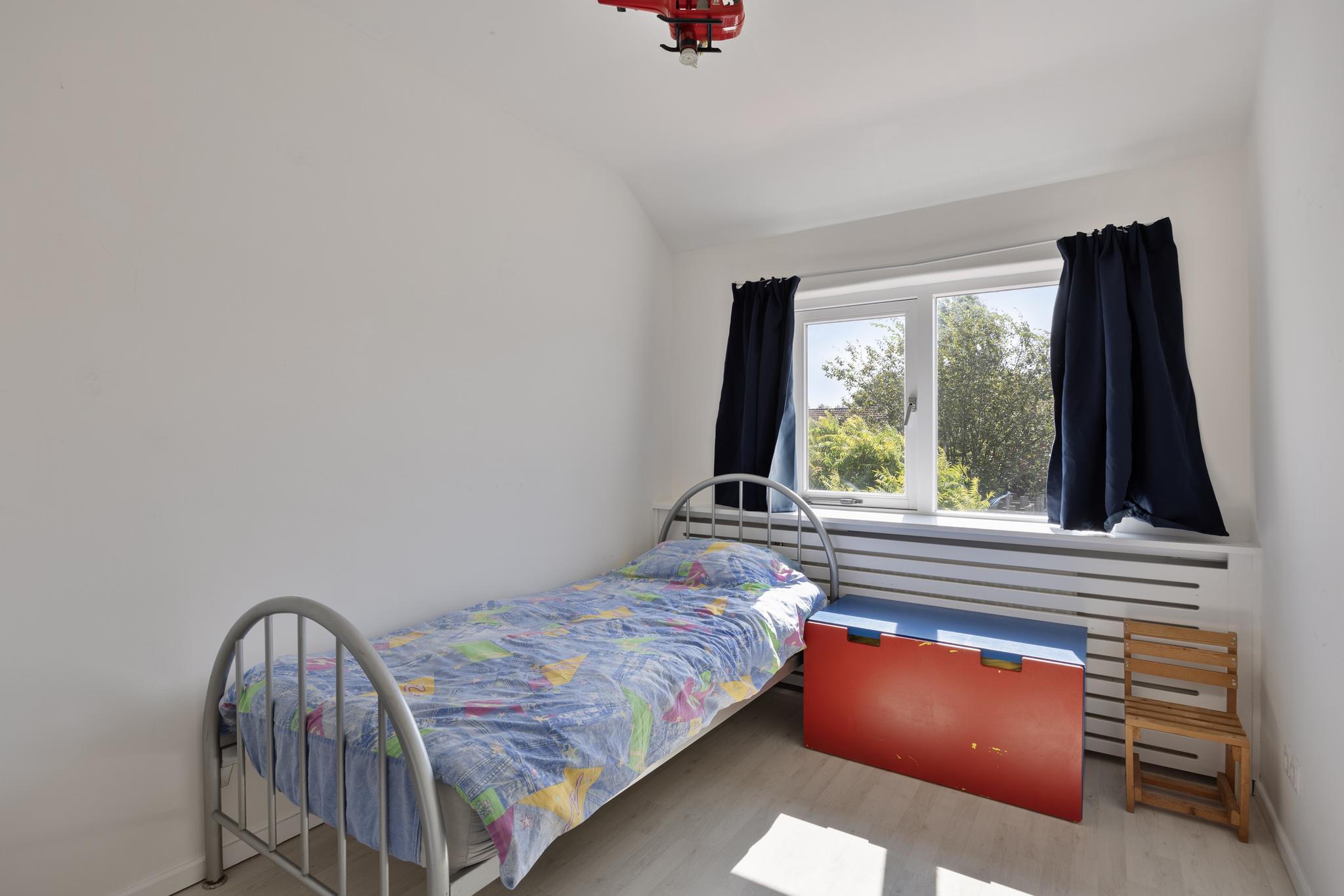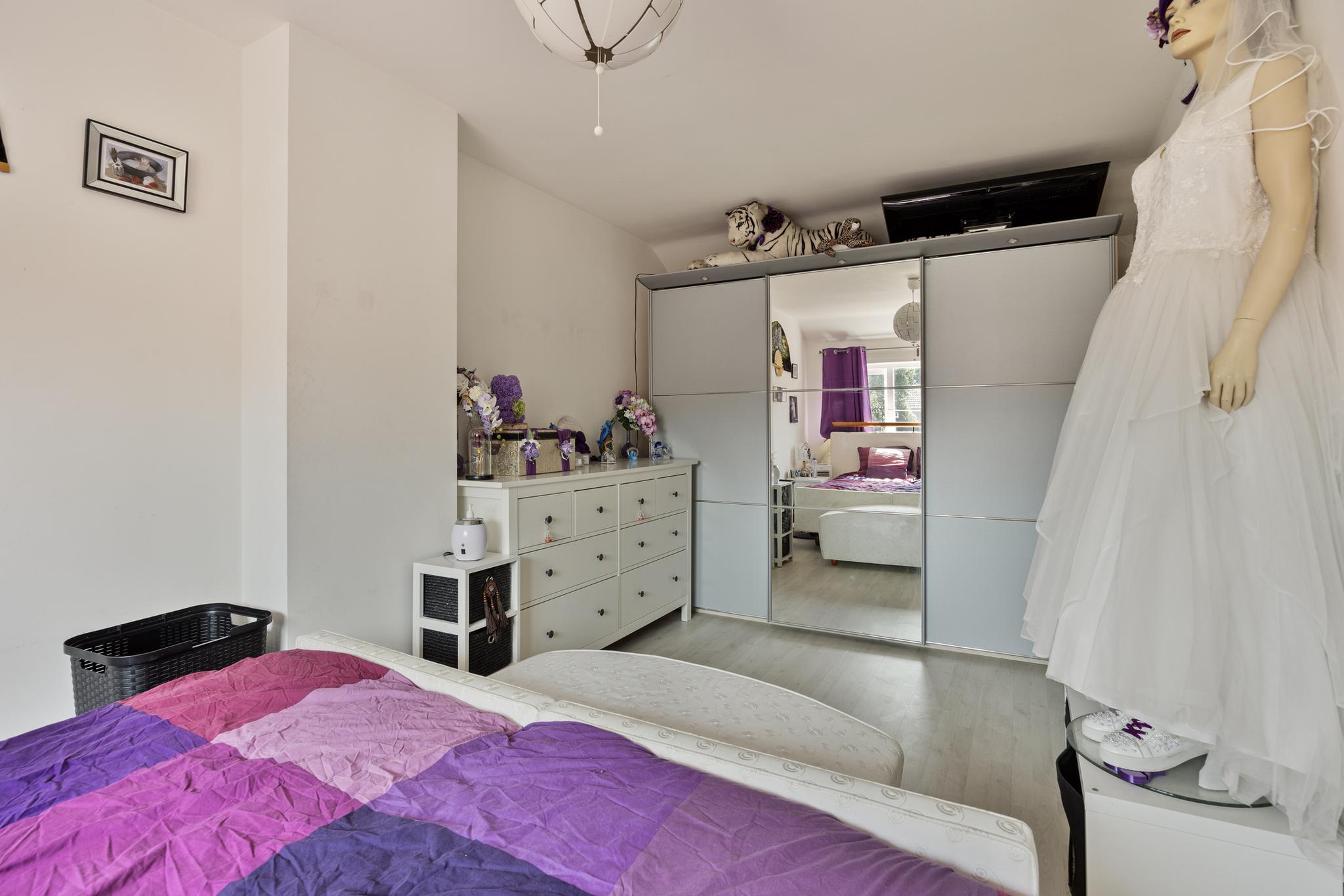 Slaapkamer 3 is afgewerkt met een laminaatvloer, pleisterwerk wanden en een stucwerk plafond.
