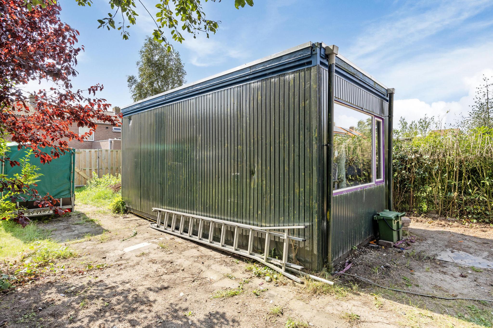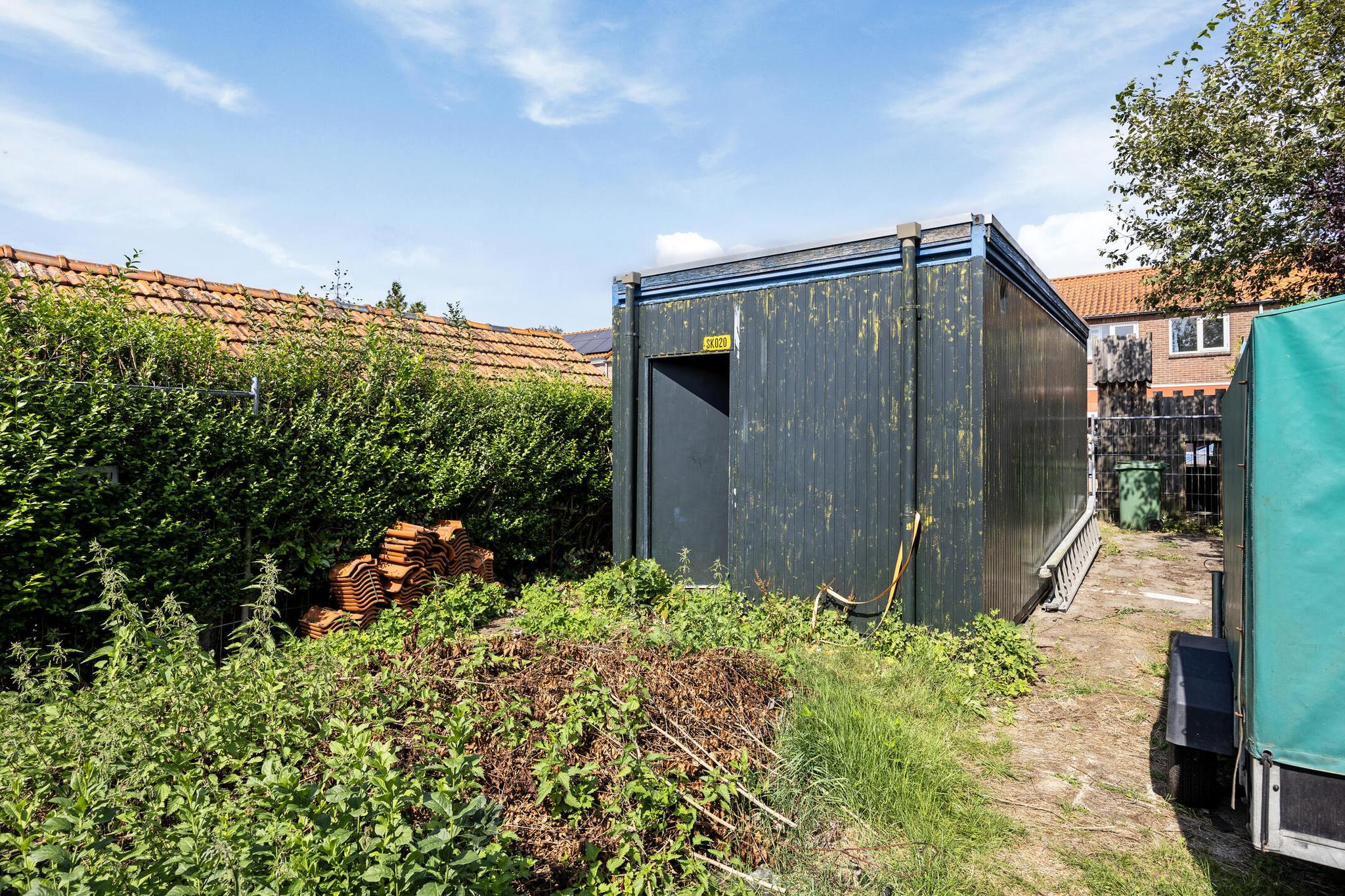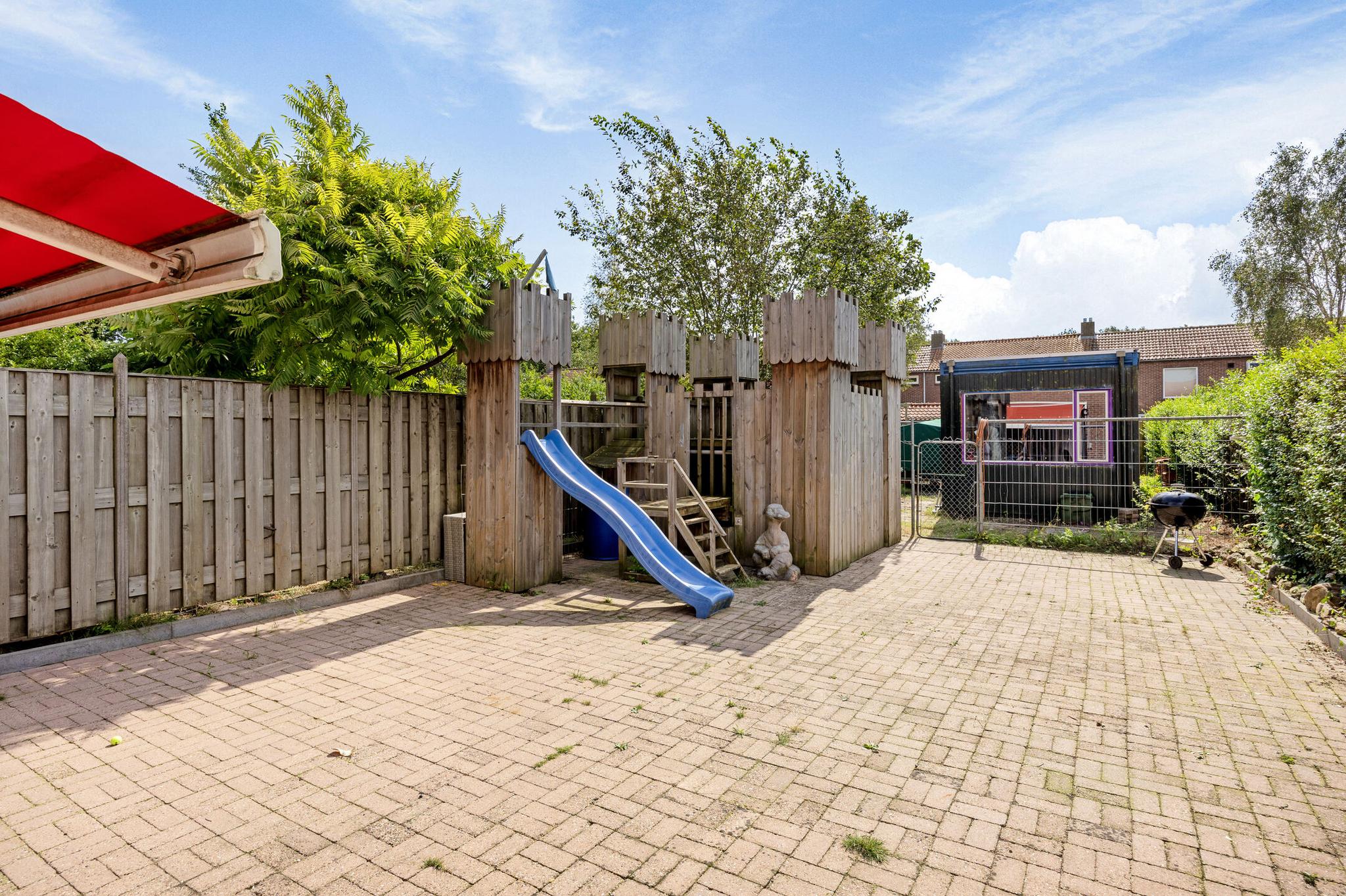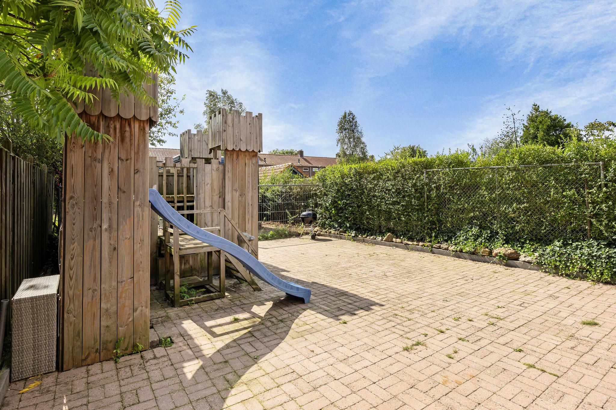 De circa 10 meter diepe achtertuin is aangelegd met sierbestrating en afgescheiden met een houten deels natuurlijke afscheiding.