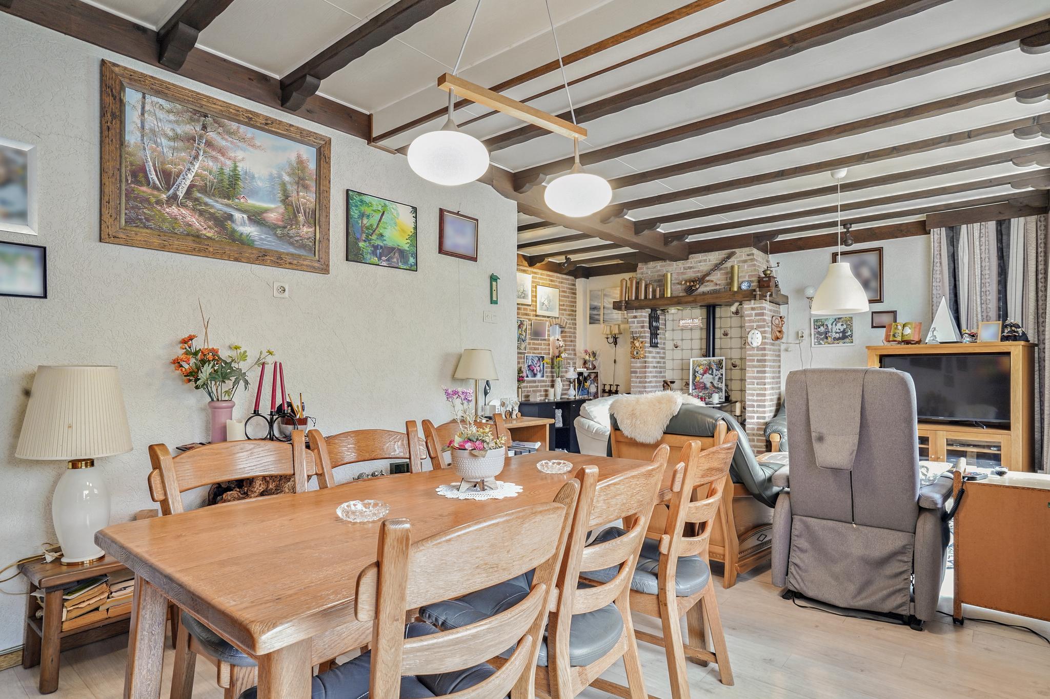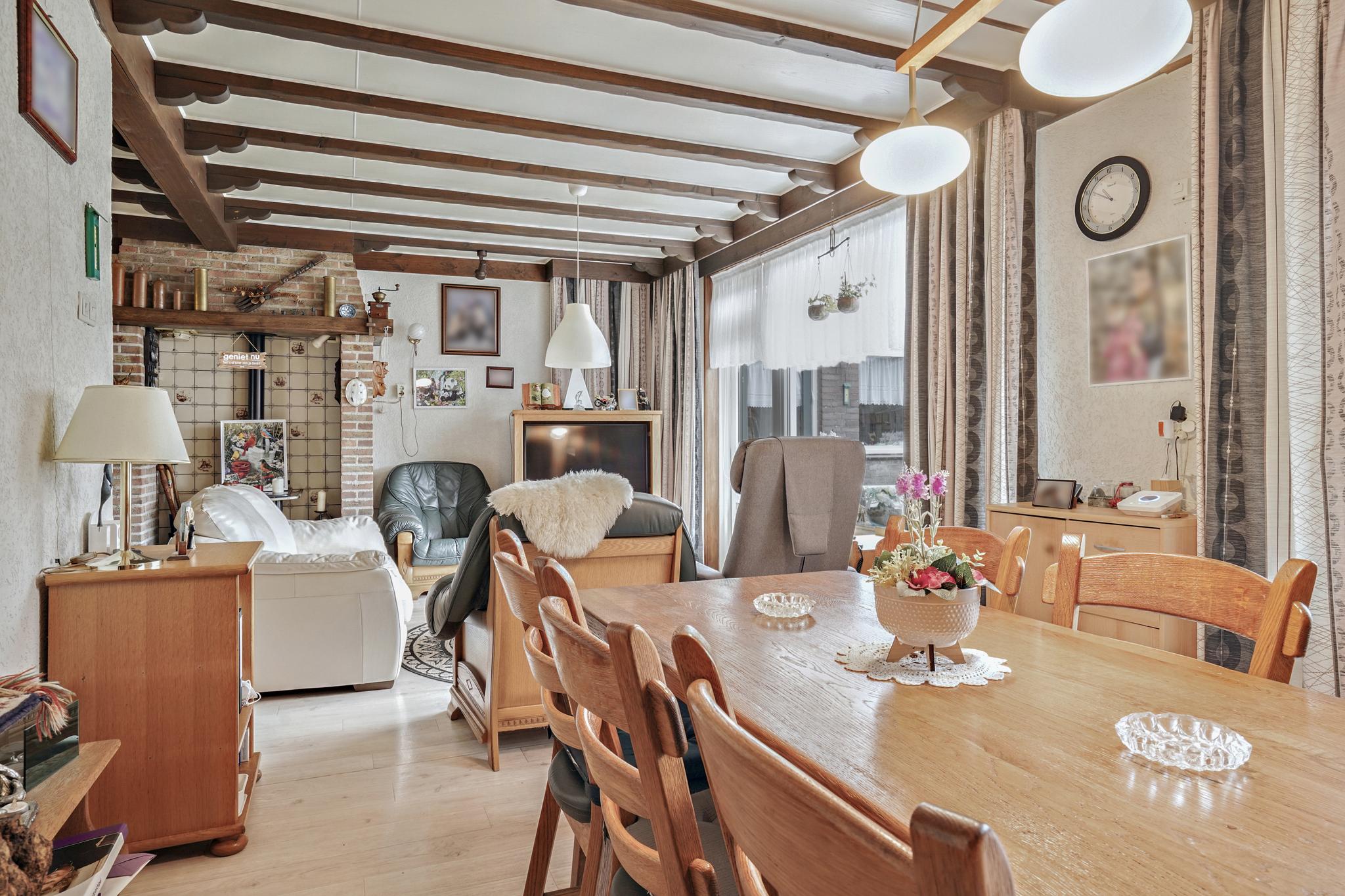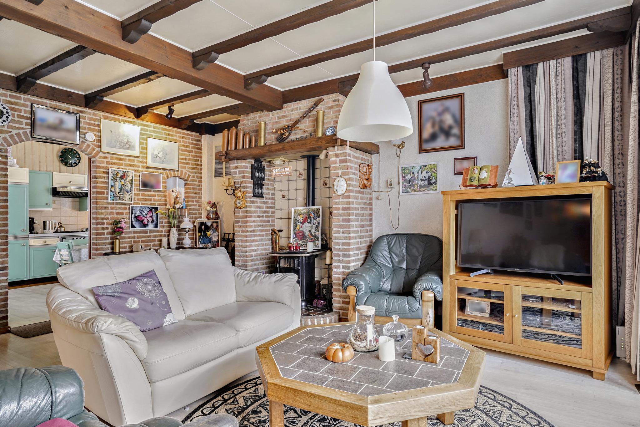 De gezellige woonkamer met een sfeervolle schouw is afgewerkt met een vinyl vloer, granol deels schoonmetselwerk wanden en een sierbalken plafond.