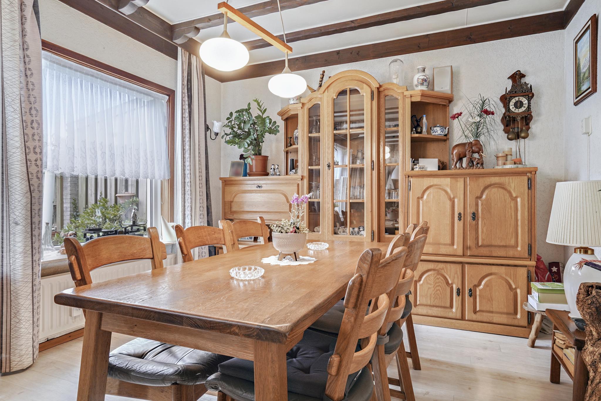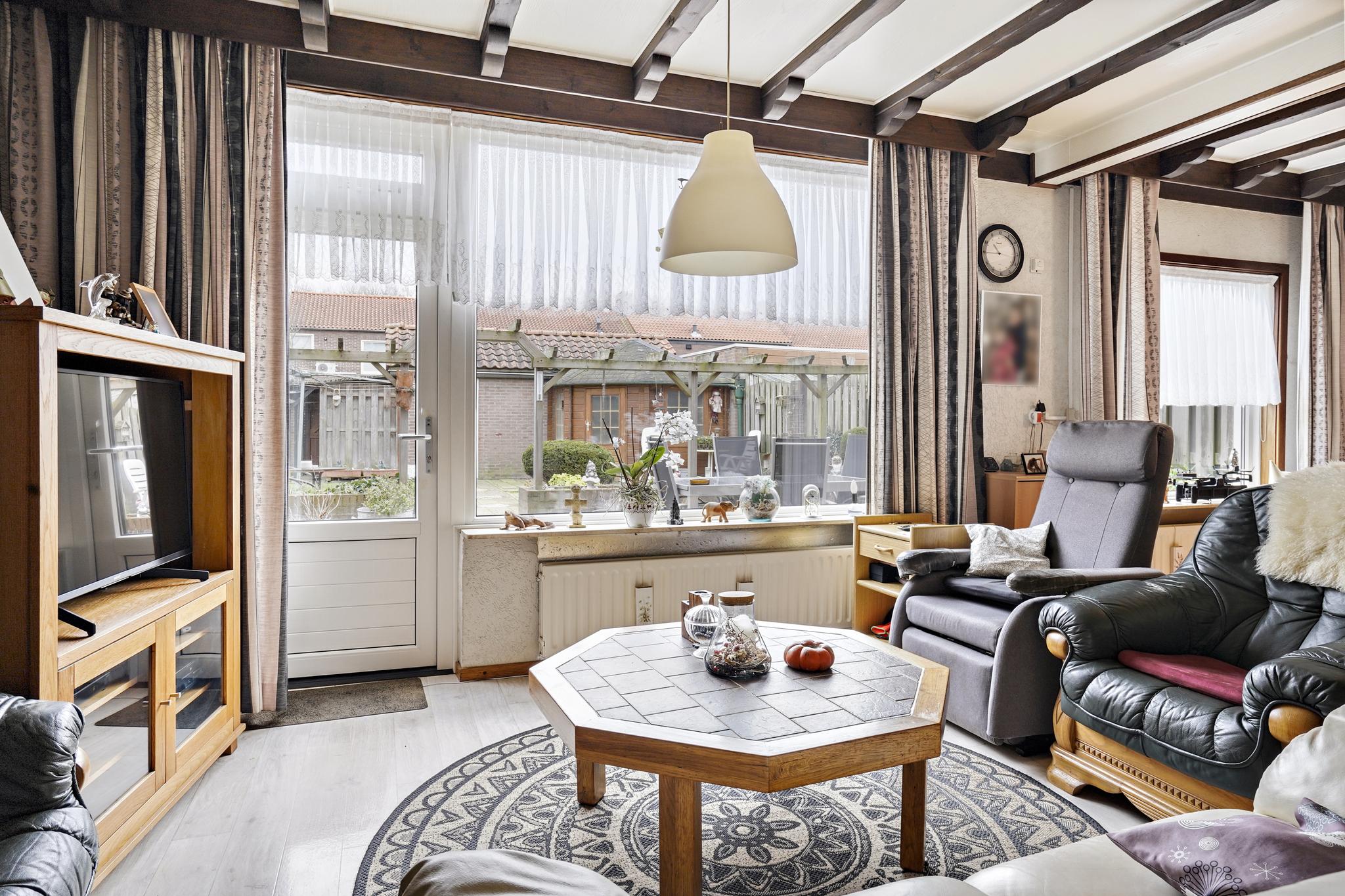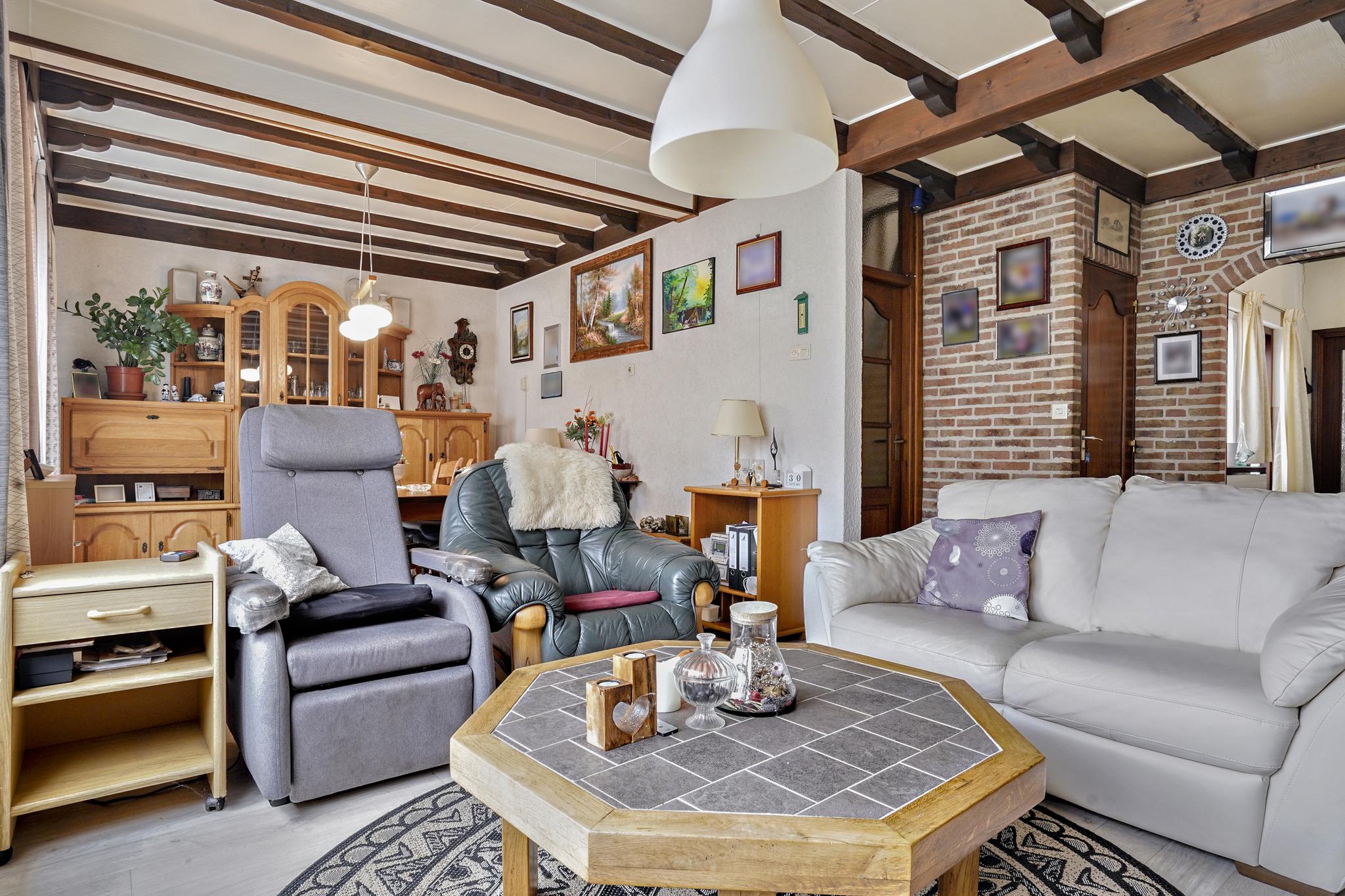 De gezellige woonkamer met een sfeervolle schouw is afgewerkt met een vinyl vloer, granol deels schoonmetselwerk wanden en een sierbalken plafond.