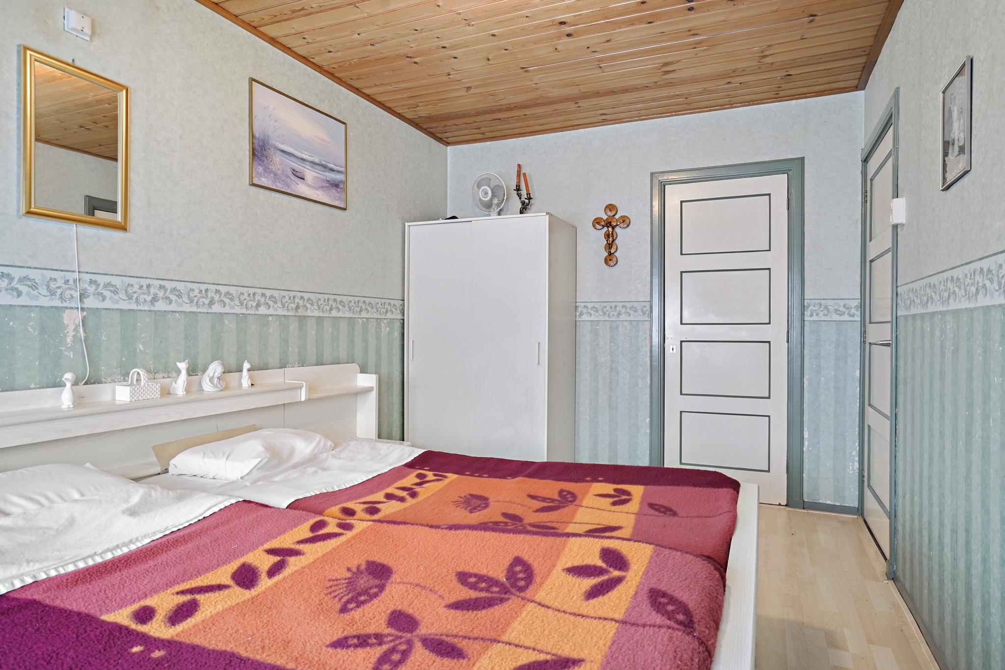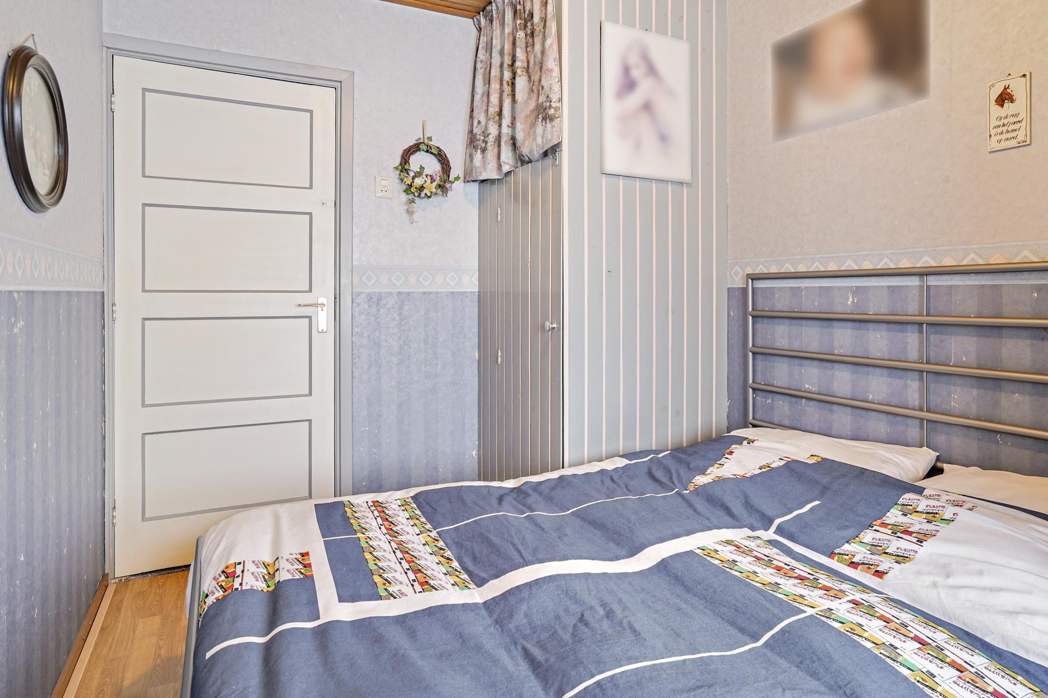 Slaapkamer 1 aan achterzijde met een vaste kast en de kamer is afgewerkt met een laminaatvloer, behangen wanden en een houten delen plafond.