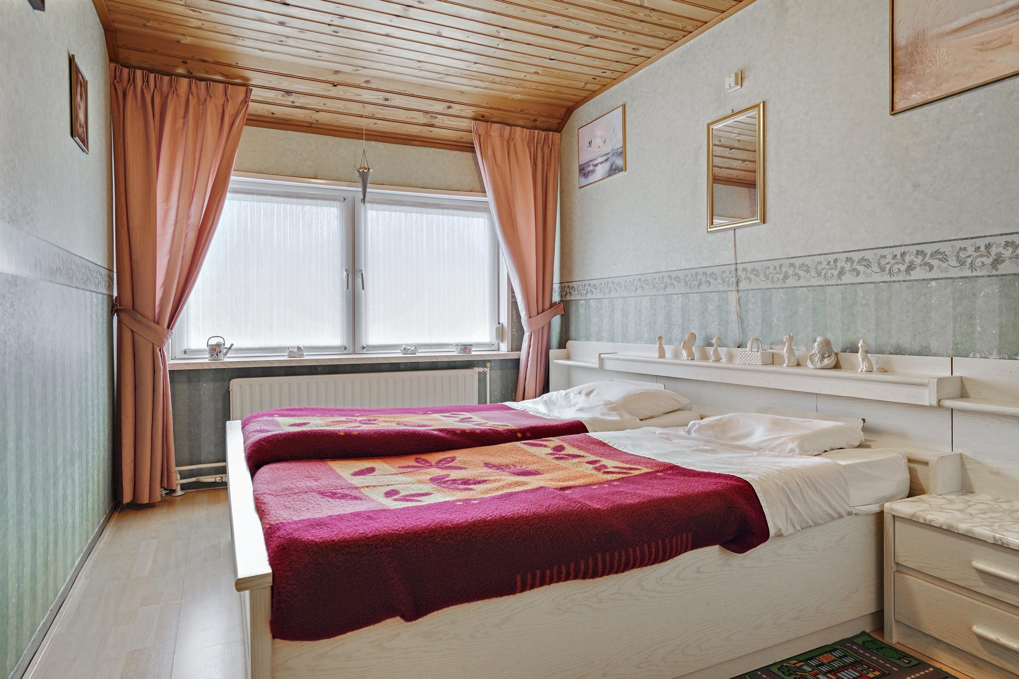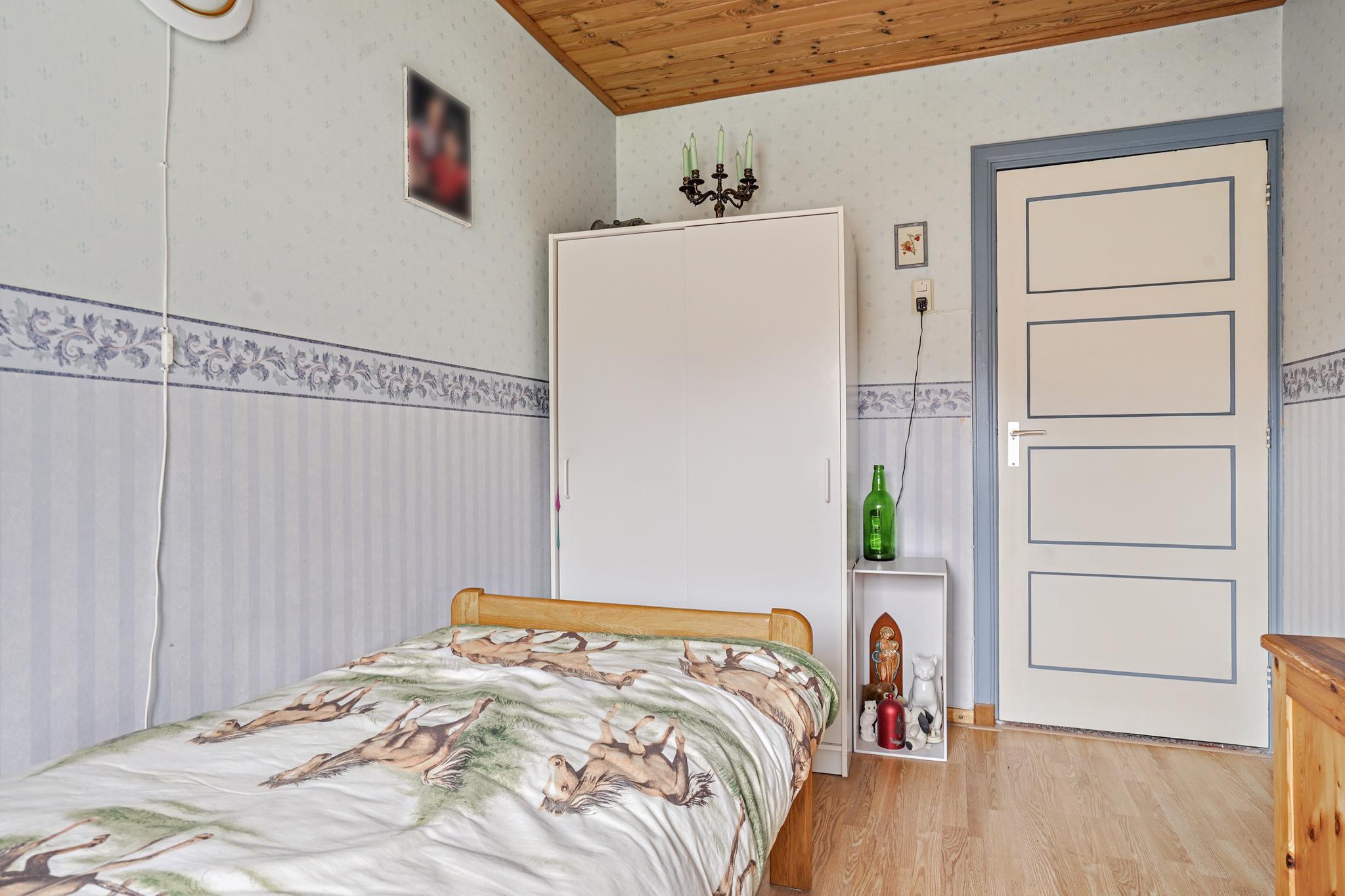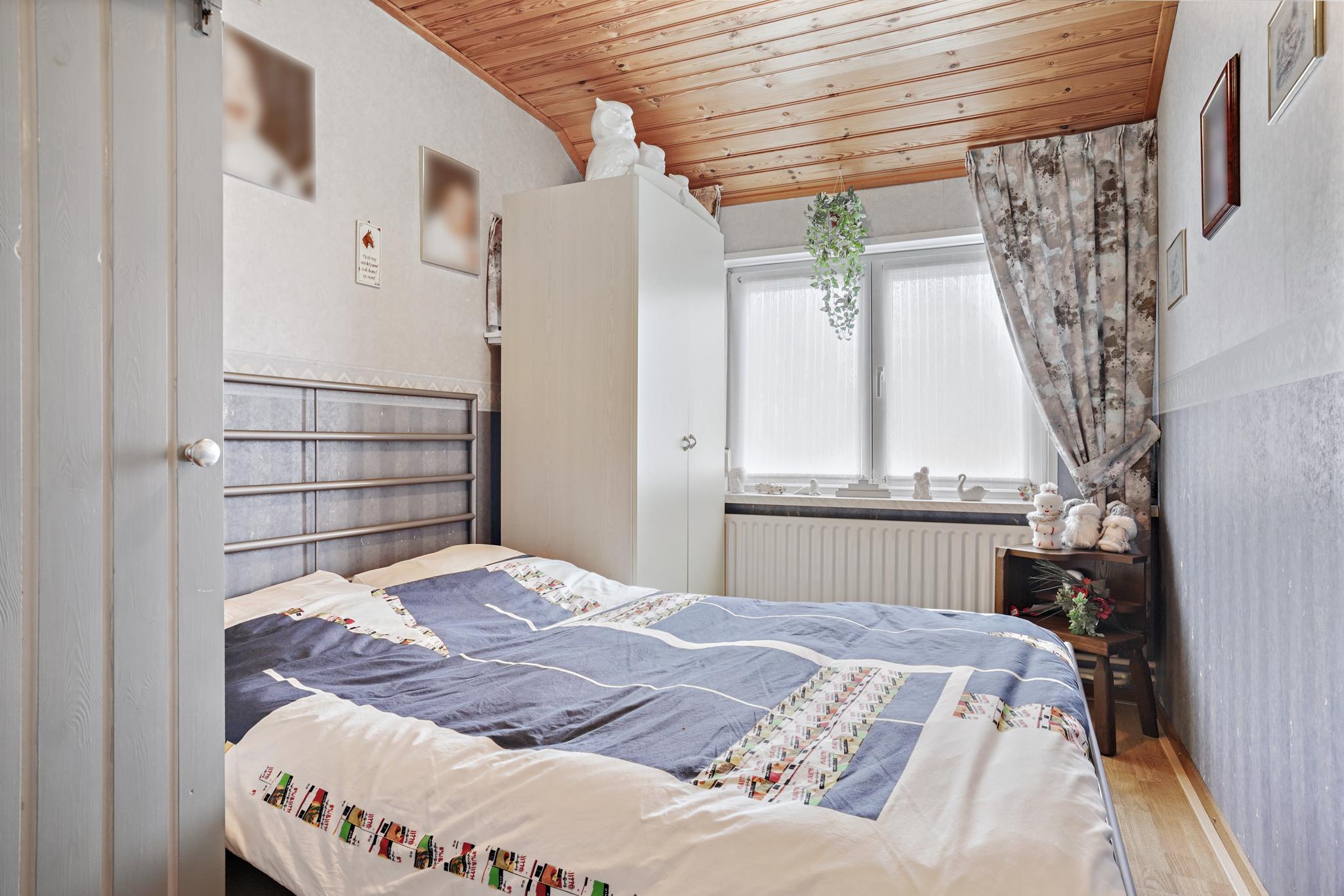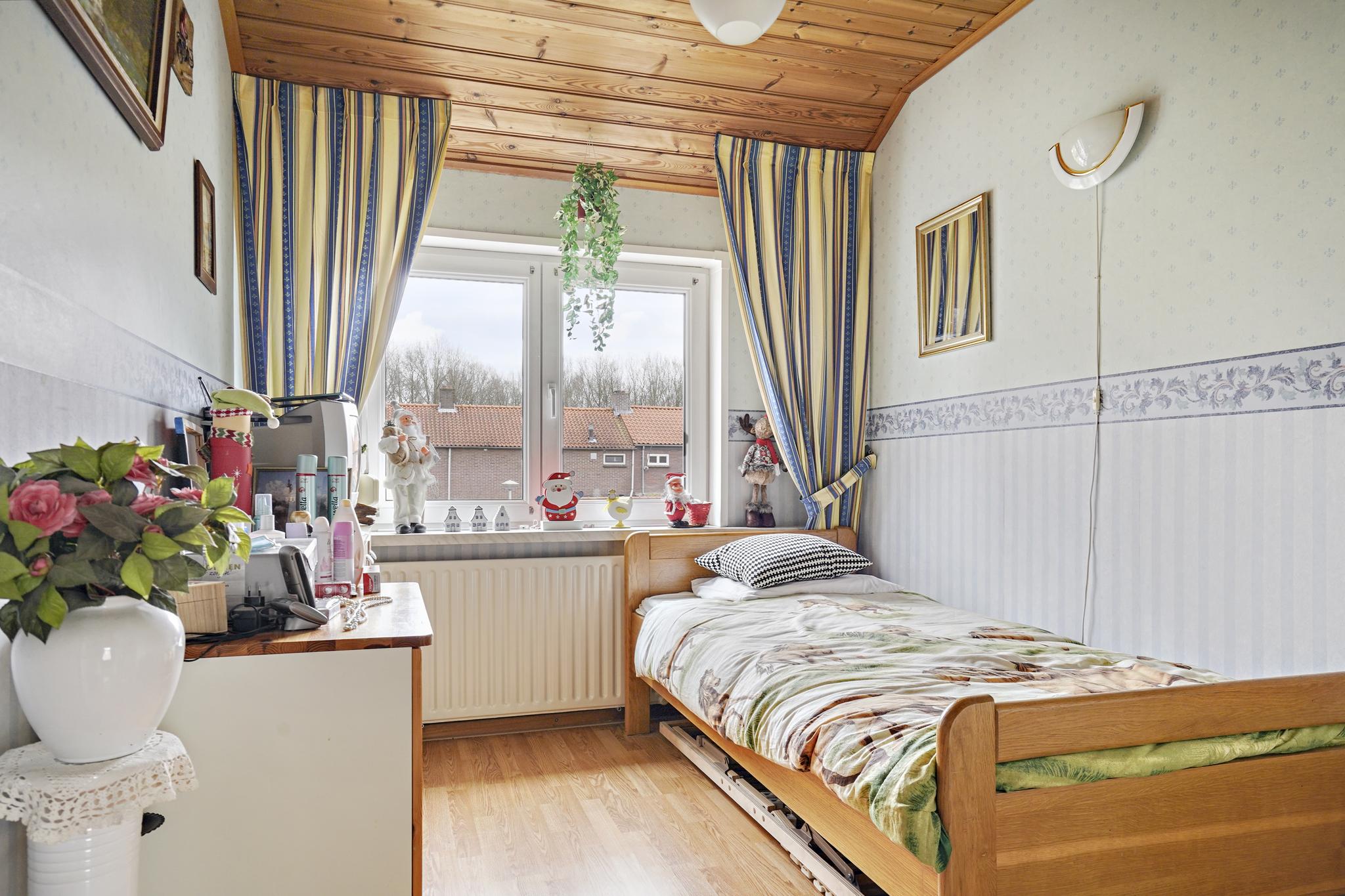 Slaapkamer 2 aan achterzijde is afgewerkt met een laminaatvloer, behangen wanden en een houten delen plafond.