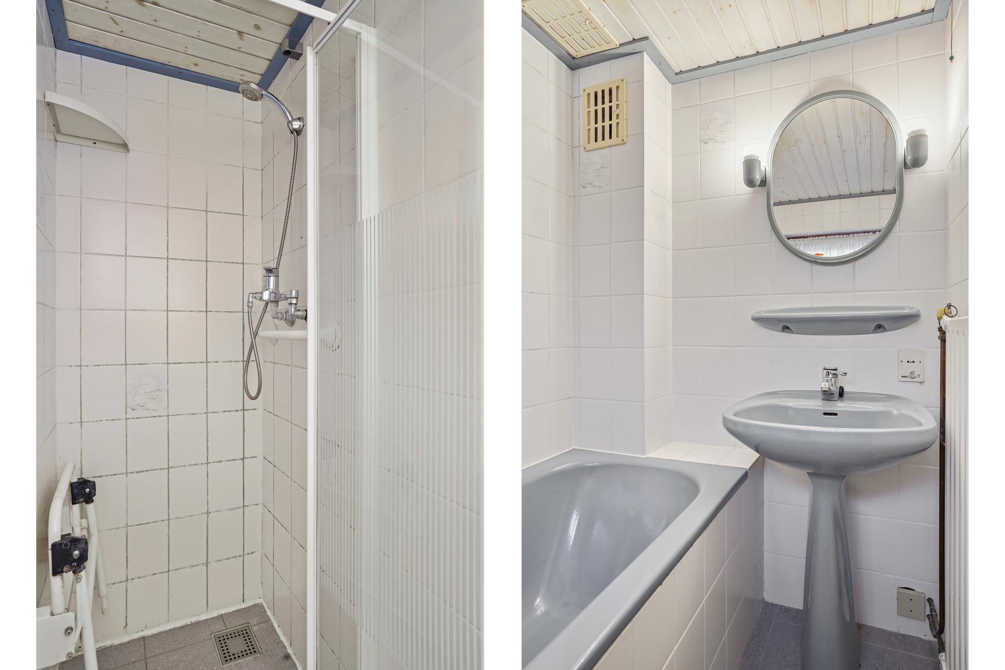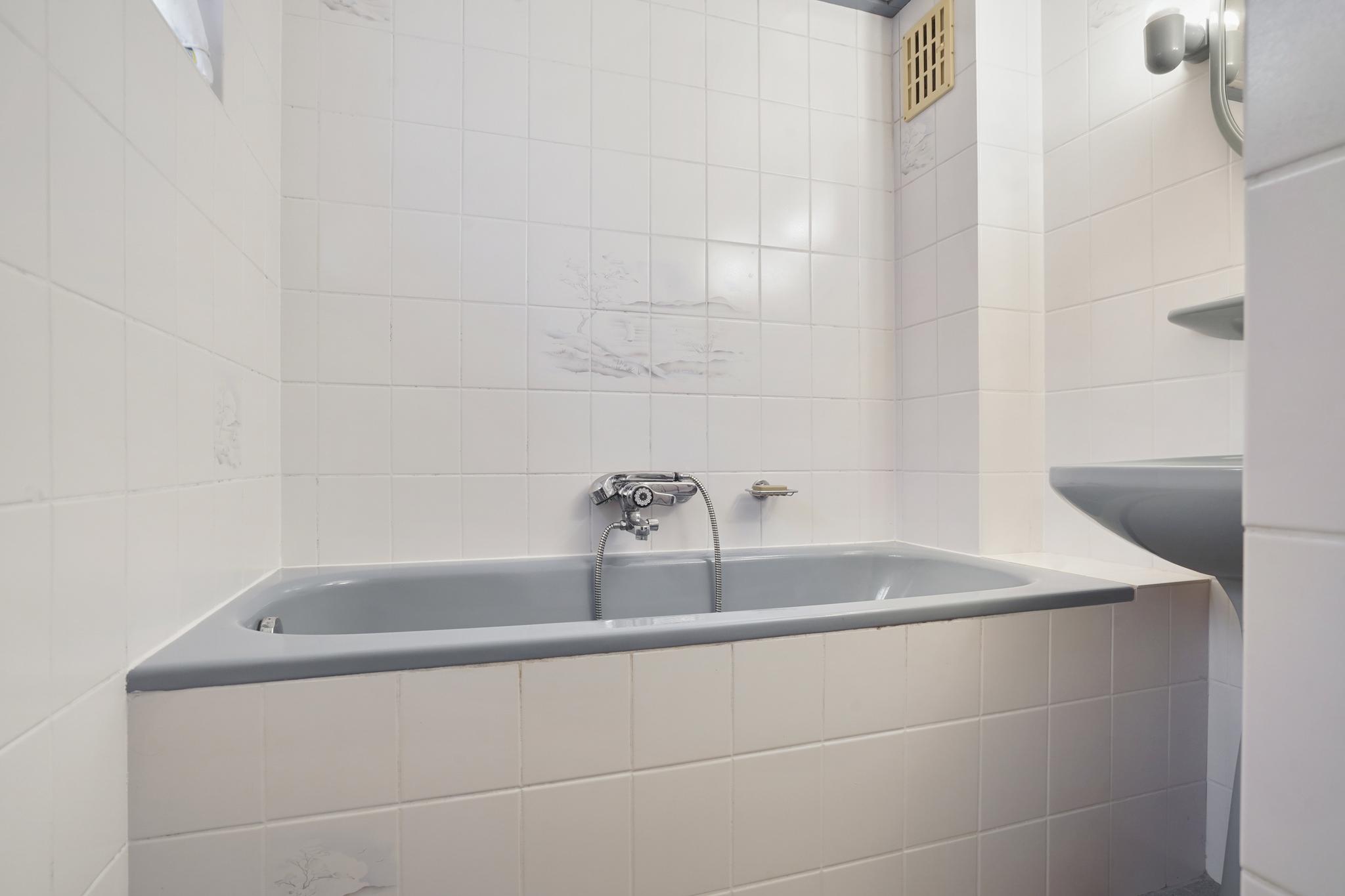 Betegelde badkamer voorzien van een ligbad, wastafel en separate douchecabine.