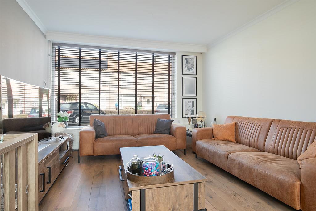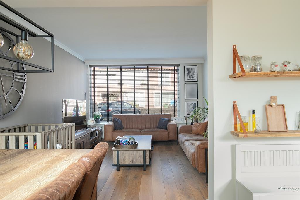 De sfeervolle living is afgewerkt met een massief houten delen vloer, stucwerk wanden en een stucwerk plafond met inbouwverlichting.