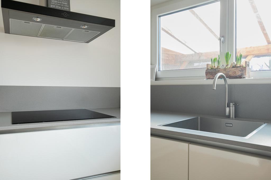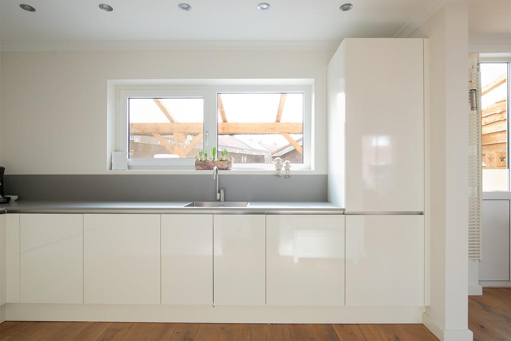 Deze keuken is voorzien van een recent vernieuwde luxe keukeninrichting in hoekopstelling met diverse laden en kastjes, composiet werkblad, combi oven/magnetron, inductie kookplaat, RVS afzuigkap, vaatwasmachine en koelkast.