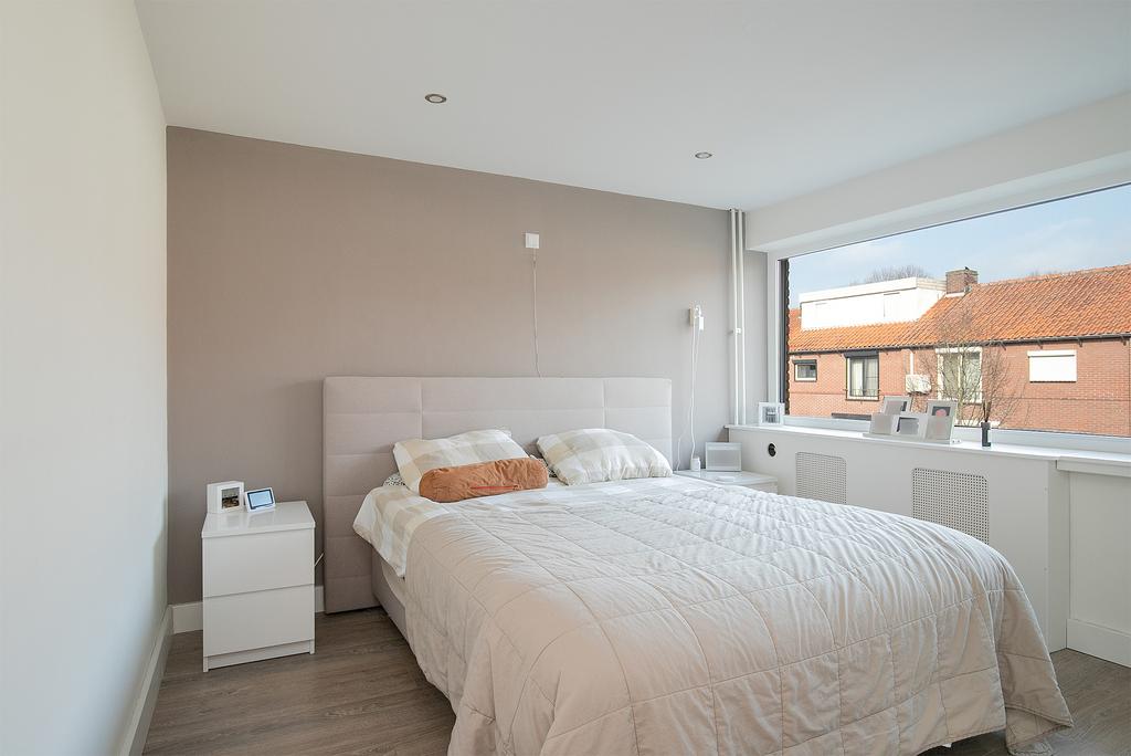 Slaapkamer 1 aan voorzijde is afgewerkt met een laminaatvloer, strak stucwerk wanden en -plafond.