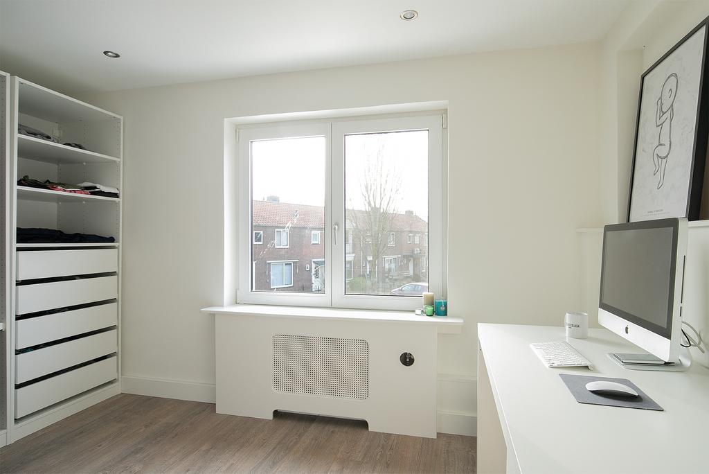 Slaapkamer 2 aan achterzijde is afgewerkt met een laminaatvloer, strak stucwerk wanden en -plafond.