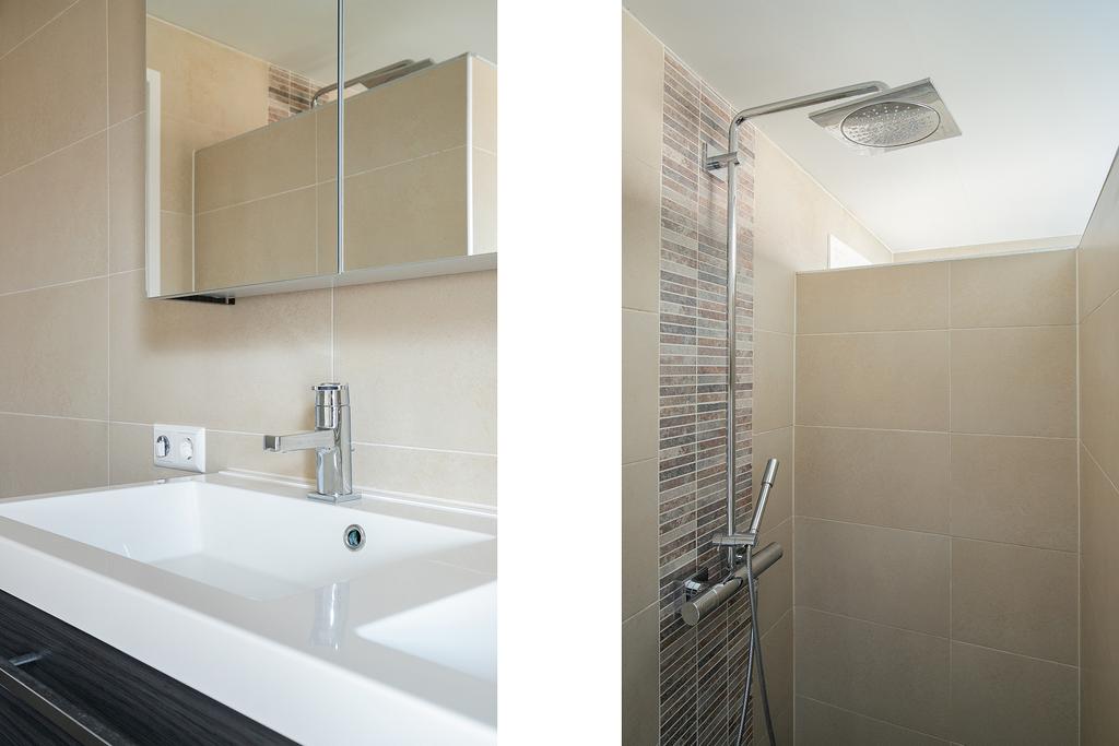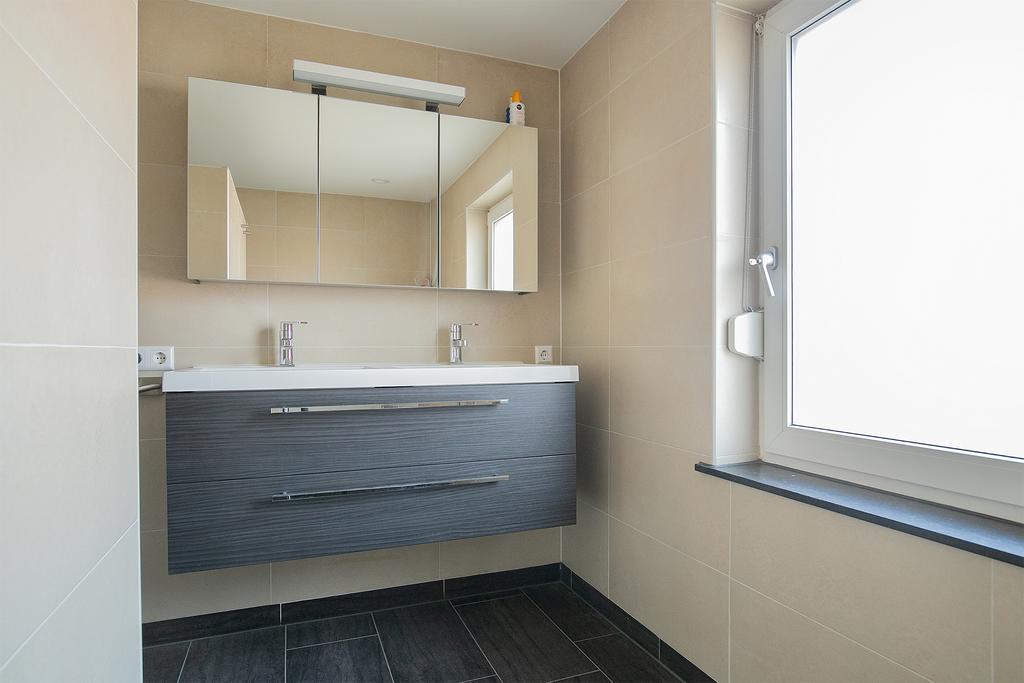 Eigentijdse betegelde badkamer voorzien van vloerverwarming, een inloopdouche met thermostaatkraan, zwevend closet en een badmeubel met geïntegreerde dubbele wastafel.
